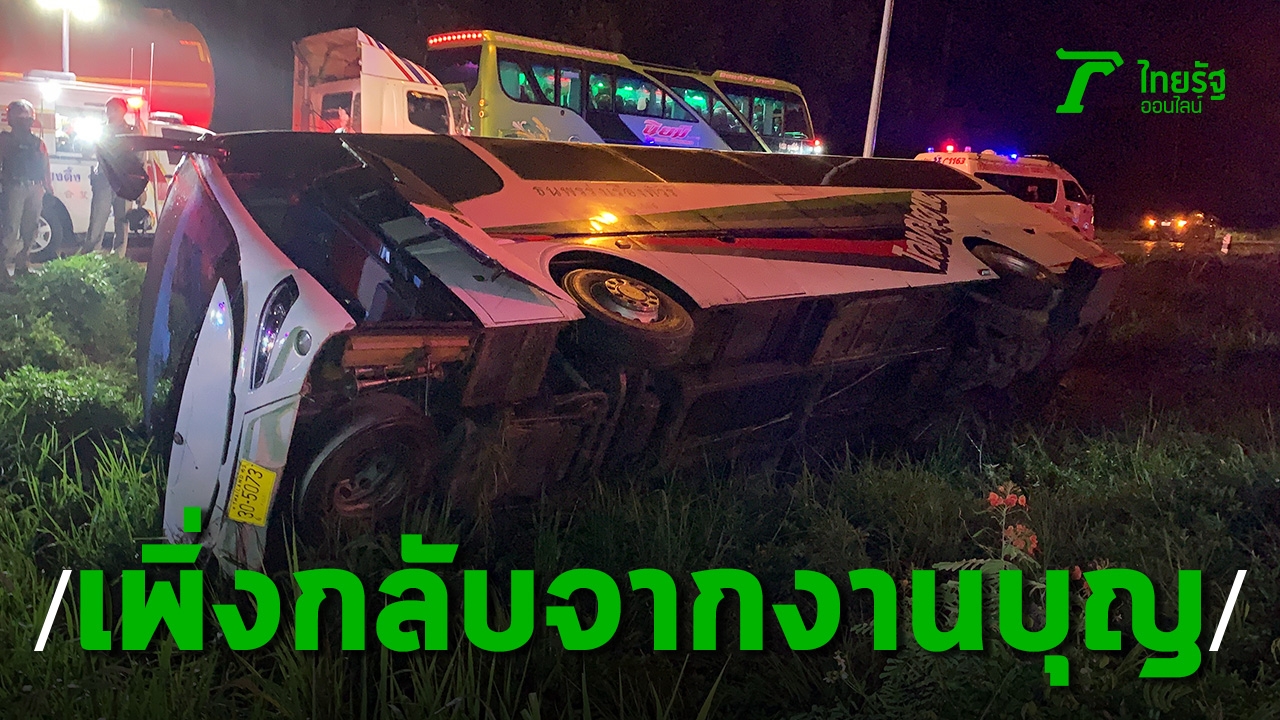 รถทัวร์นำเที่ยว ขน 56 ชีวิต จากสงขลา กลับจากงานบุญ ทอดกฐินกระบี่ เกิดส่ายไปมา พุ่งลงข้างทางพลิกคว่ำ เจ็บ 18 คาดฝนตก-ถนนลื่น