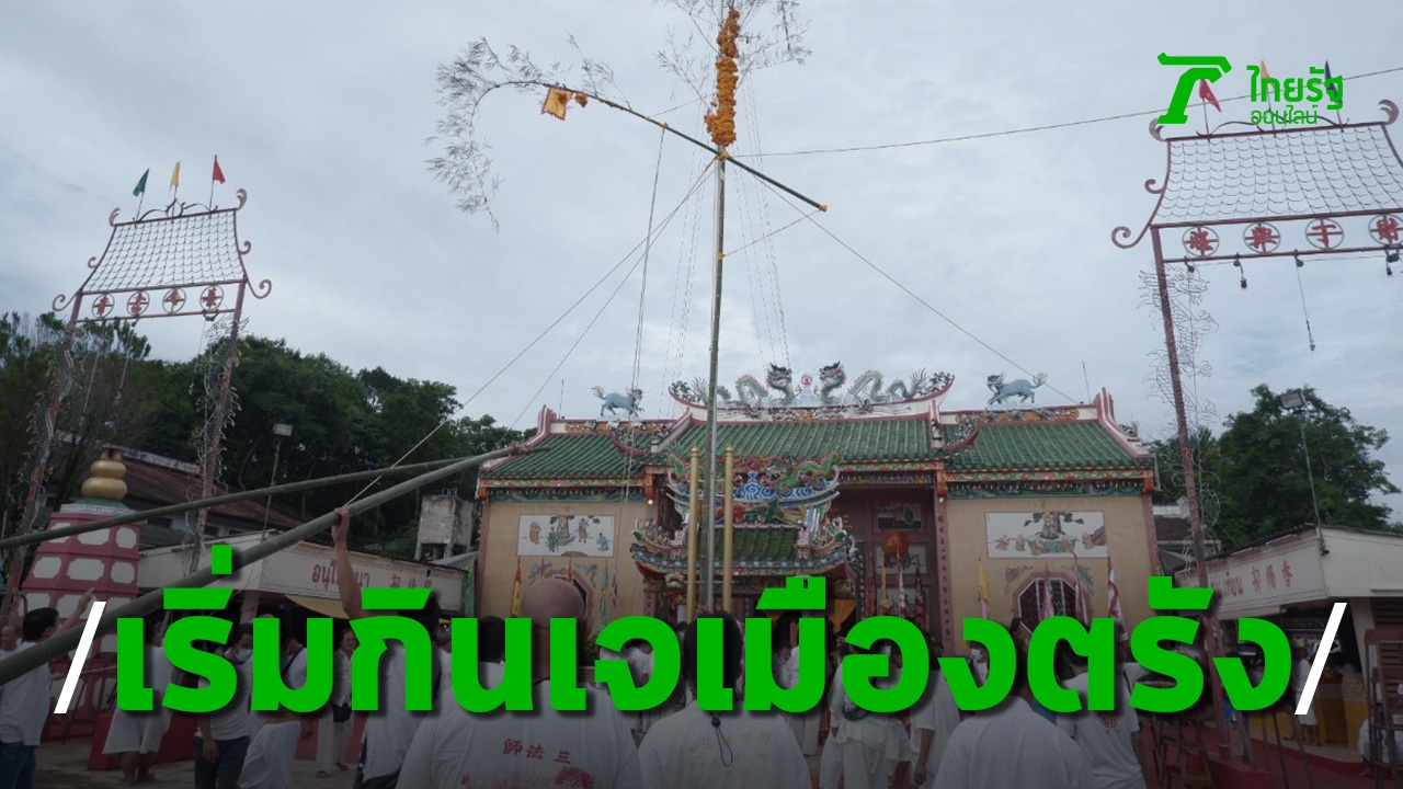 เทศกาลถือศีลกินผัก "กินเจเมืองตรัง" เริ่มแล้วแบบนิวนอร์มอล ศาลเจ้าพ่อหมื่นรามทำพิธีขึ้นเสาเต็งโก นักท่องเที่ยว-ประชาชน แห่ร่วมพิธีบุญคึกคัก เตรียมรับองค์พระคืนนี้กว่า 600 องค์ประทับร่างทรง