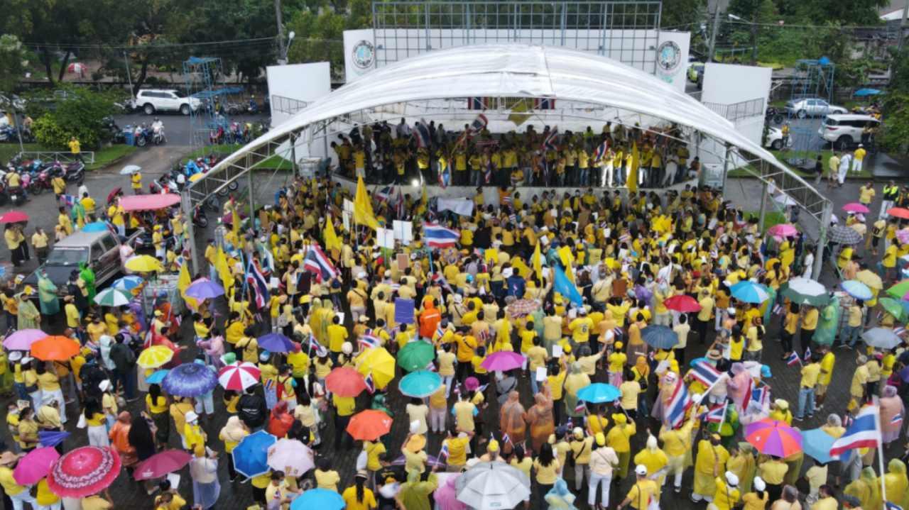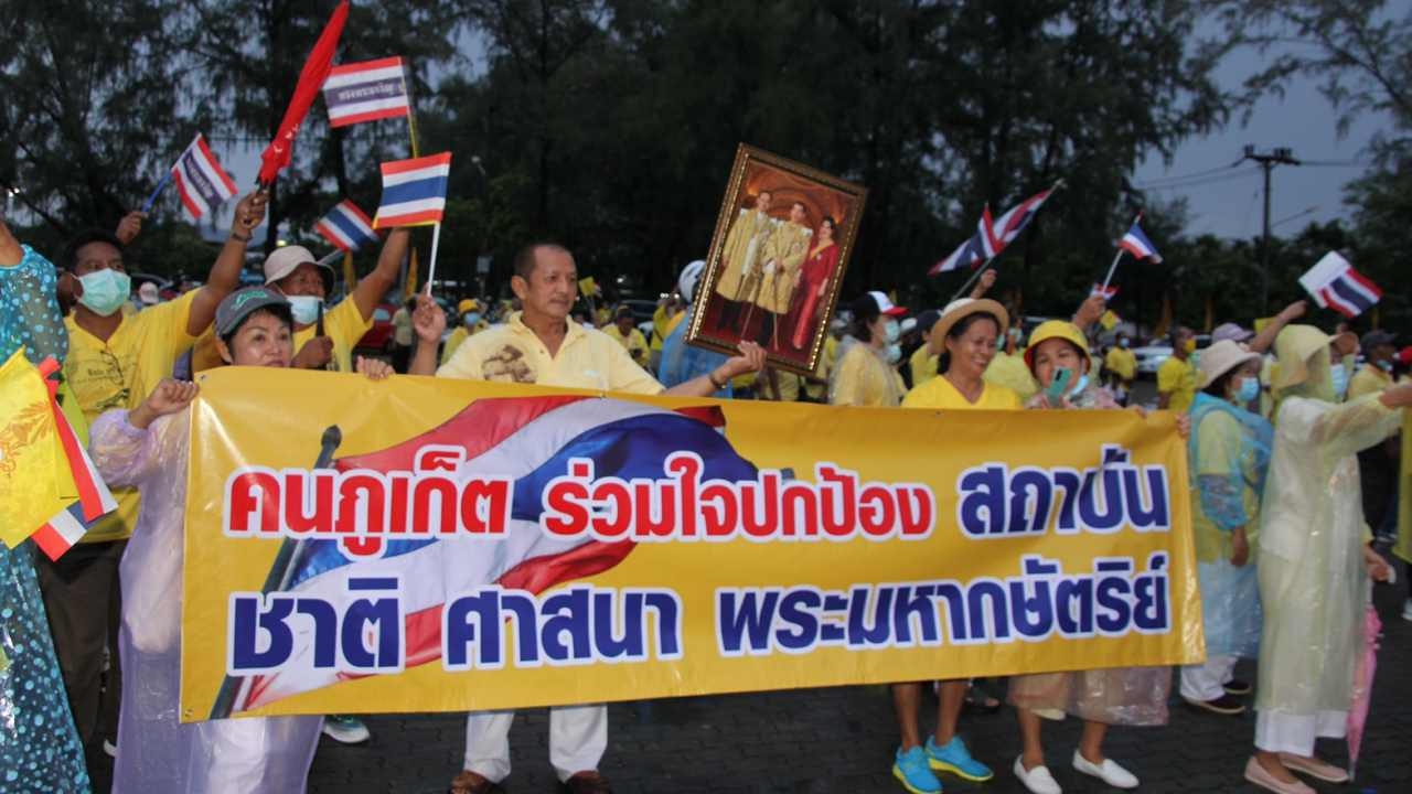 คนภูเก็ต 3 อำเภอ พร้อมใจสวมเสื้อเหลือง ร่วมชุมนุมที่ลานเวทีกลางสะพานหิน ท่ามกลางสายฝน ชูป้ายข้อความ “การปกป้องสถาบันพระมหากษัตริย์ คือหน้าที่ของคนไทยผู้จงรักภักดี” ร่วมร้องเพลงชาติ พร้อมเปล่งเสียงทรงพระเจริญ