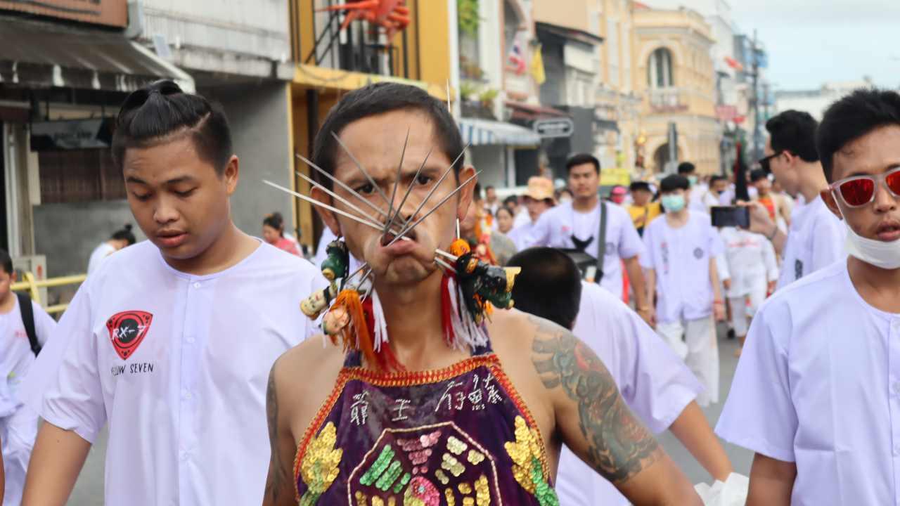 ศาลเจ้ากะทู้ต้นตำนานกินเจภูเก็ต ประกอบพิธีอันศักดิ์สิทธิ์ "อิ้วเก้ง" แห่พระรอบเมือง ม้าทรงแสดงอภินิหารรับเคราะห์แทนผู้ร่วมพิธี ในวันที่ 8 ของประเพณีถือศีลกินผักประจำปี