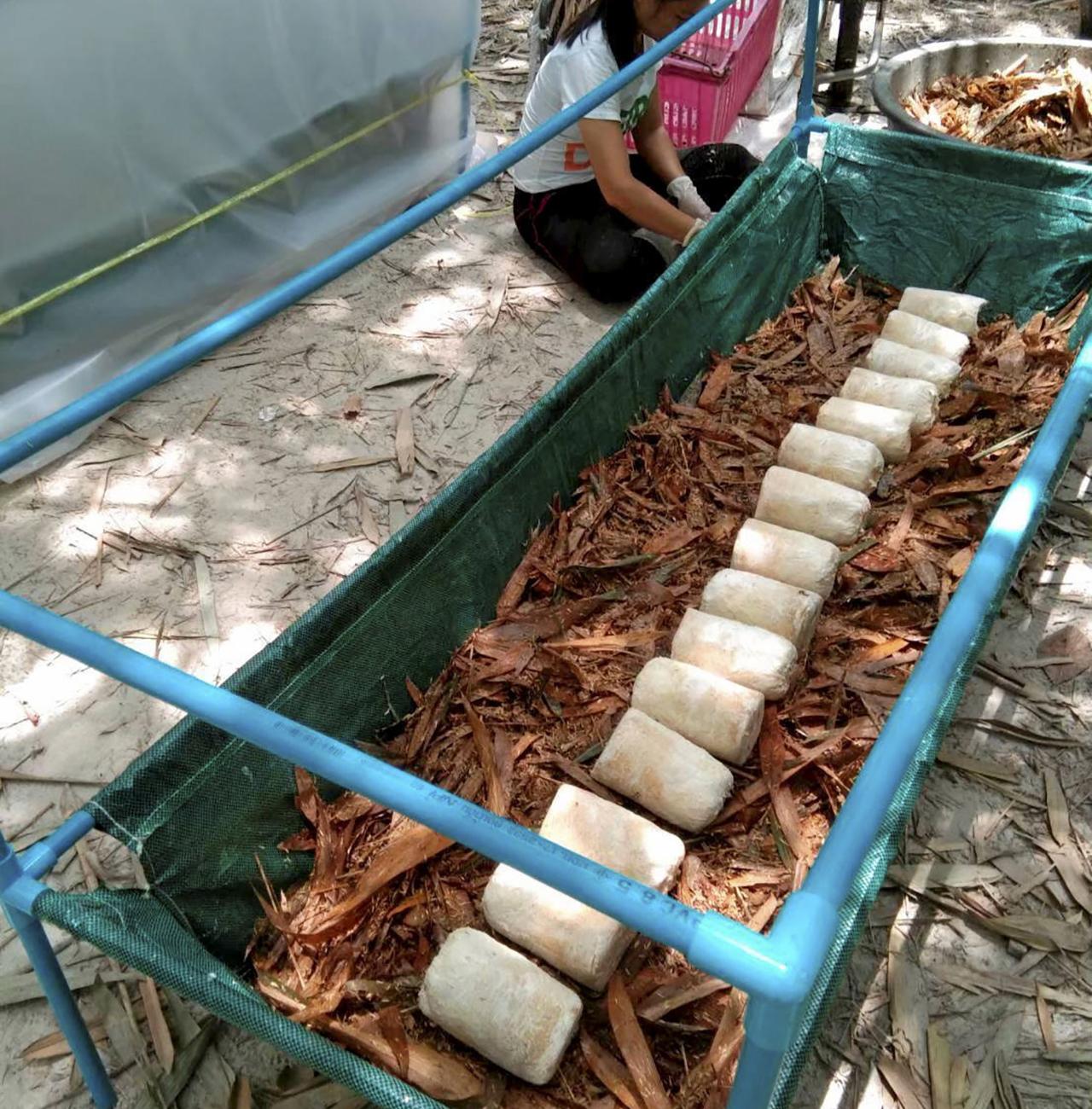 จากนั้นนำเชื้อก้อนเห็ดที่มีเส้นใยเห็ดร่างแหเจริญเต็มถุงแล้วใส่ลงไปในภาชนะปลูก ถ้าเป็นแปลงปลูกกับพื้นให้ใส่เชื้อเห็ดลงไป 10 ก้อน...ปลูกแบบคอนโด 3 ชั้น ให้ใส่ชั้นละ 4 ก้อนต่อชั้น...ปลูกในตะกร้าพลาสติกใส่ลงไป 2 ก้อน