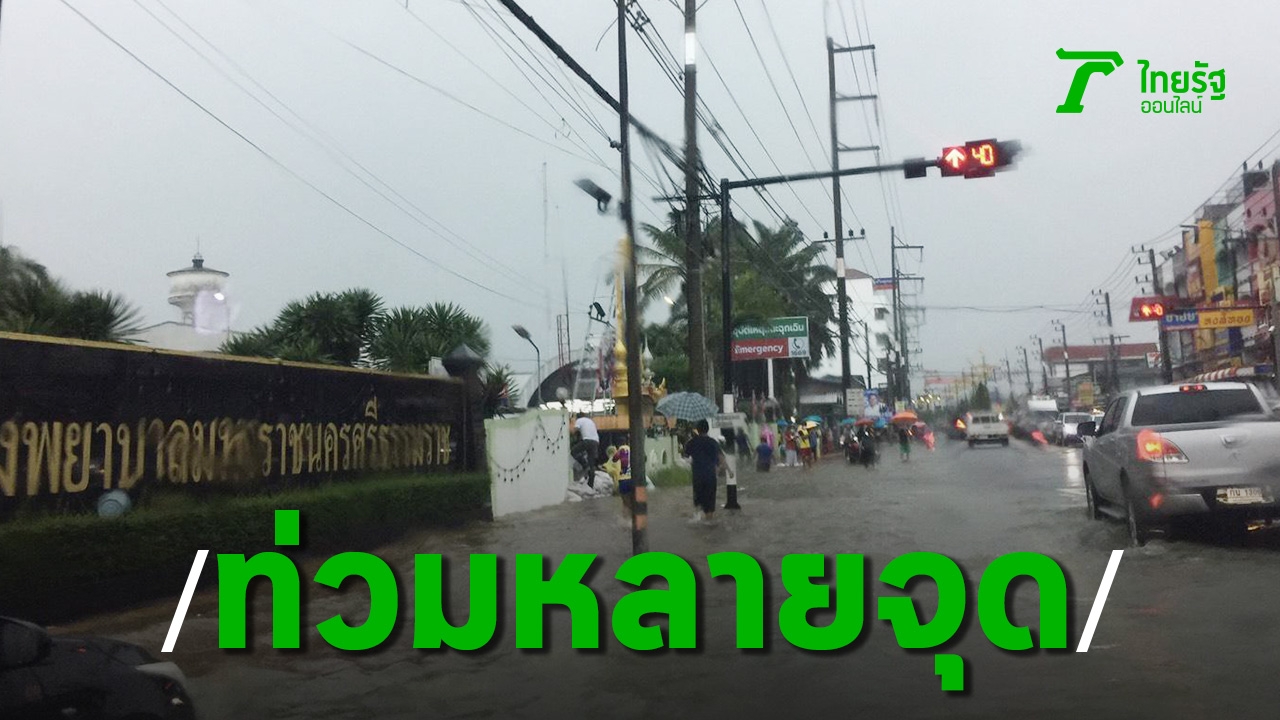 นครศรีธรรมราช น้ำท่วมหลายจุด หลังฝนตกหนักต่อเนื่อง ขณะที่สนามบิน ยังเปิดให้บริการปกติ โรงพยาบาลมหาราชนครศรีธรรมราช กั้นกระสอบทราย ป้องกันน้ำทะลัก