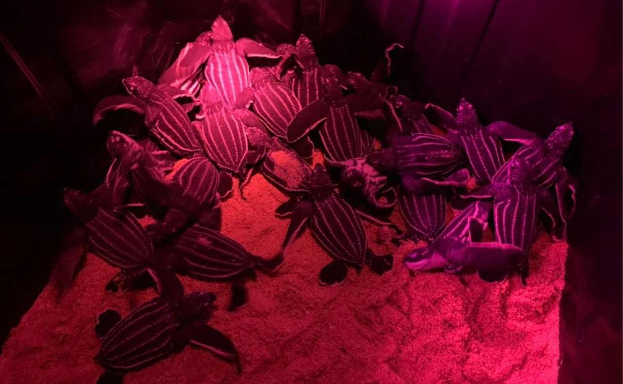 ลูกเต่ามะเฟือง รังที่ 2 หาดบางขวัญ พังงา คลานออกจากหลุมหลังแม่เต่าขึ้นมาวางไข่ ผ่านไป 57 วัน นับจำนวนลูกเต่าได้ 68 ตัว ตาย 13 เหลือ 55 ตัว โดยก่อนหน้านั้น พบรอยแม่เต่าขนาดใหญ่ขึ้นมาวางไข่ จนท.เก็บหนีน้ำขึ้นมาเพาะฟัก