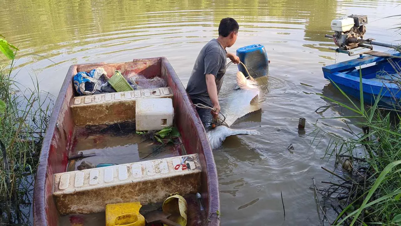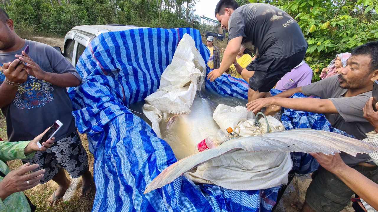ส่วนการยกปลาบึกยักษ์ตัวนี้ขึ้นจากคลองอู่ตะเภา ต้องใช้คนช่วยกันยกถึง 7 คนนำใส่ท้ายรถกระบะซึ่งมีผ้ายางใส่น้ำเอาไว้ และรีบนำไปส่งให้กับคนซื้อทันที เนื่องจากปลาบึกเริ่มอ่อนเพลีย