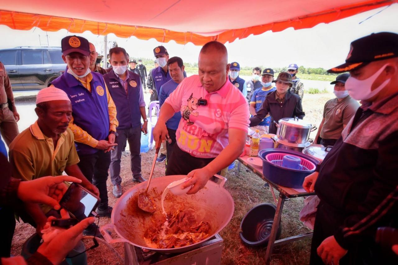ต่อมาแม่ทัพภาคที่ 4 และคณะ เดินทางต่อไปยังชุมชนบ้านบางปู เพื่อเยี่ยมชมการดำเนินงานของโครงการธนาคารปูดำของกลุ่มชุมชนบ้านบาลาดูวอ ตำบลบางปู อำเภอยะหริ่ง จังหวัดปัตตานี ที่เดิมทีนั้นเป็นพื้นที่รกร้าง จนได้รับบริจาคจากพี่น้องไทยพุทธในพื้นที่ มอบประโยชน์ของที่ดินแห่งนี้ให้เป็นแหล่งส่งเสริมอาชีพการเลี้ยงปูดำ ทำประโยชน์สร้างรายได้และเศรษฐกิจให้แก่คนในชุมชน และเมื่อมาถึงบ่อเลี้ยงปูดำ แม่ทัพภาคที่ 4 ได้ลงเรือสาธิตการจับปูดำในบ่อ มัดเชือกปู และปรุงอาหารโดยใช้วัตถุดิบจากปูดำ ให้แก่คณะและพี่น้องประชาชน กลุ่มเกษตกรได้รับประทาน ก่อนที่แม่ทัพภาคที่ 4 จะได้เดินทางไปยังกลุ่มวิสาหกิจชุมชน Hand In Hand รือเสาะ อำเภอรือเสาะ จังหวัดนราธิวาส ที่เป็นโครงการสร้างอาชีพสร้างเศรษฐกิจให้กับคนในชุมชน ผลิตและจำหน่ายเสื้อผ้ากีฬา กระเป๋า และสินค้าตามออเดอร์ ส่งเสริมและสร้างรายได้ให้กับคนในชุมชน เกิดเป็นชุมชนที่เข้มแข็ง สามารถพึ่งพาตนเองได้ เป็นตัวอย่างของการพัฒนา ผู้นำและชุมชนที่เข้มแข็ง โดยแม่ทัพภาคที่ 4 ได้เยี่ยมชมกิจการ พร้อมเสนอแนวทางผลักดันกลุ่มวิสาหกิจชุมชน บูรณาการงานสร้างรายได้ให้กับพี่น้องประชาชน ในรูปแบบชุมชนเพื่อชุมชน เป็นห่วงโซ่เศรษฐกิจในพื้นที่โดยรอบ นำไปสู่ความสุขสอดรับนโยบาย เศรษฐกิจ มั่นคง มั่งคั่ง ยั่งยืน