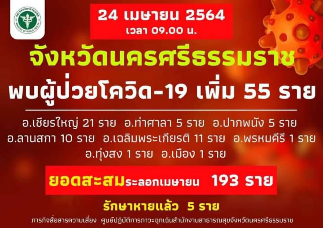 นครศรีธรรมราช ยอดติดโควิด-19 พุ่งวันเดียว 55 ราย ยอดสะสม 193 ราย หลังพบคลัสเตอร์ที่ อ.ท่าศาลา อาจารย์ ม.ดังแห่งหนึ่งนำเชื้อมาติดคนในครอบครัวและข้างบ้าน 8 ราย และเคสงานวันเกิดช่วงสงกรานต์