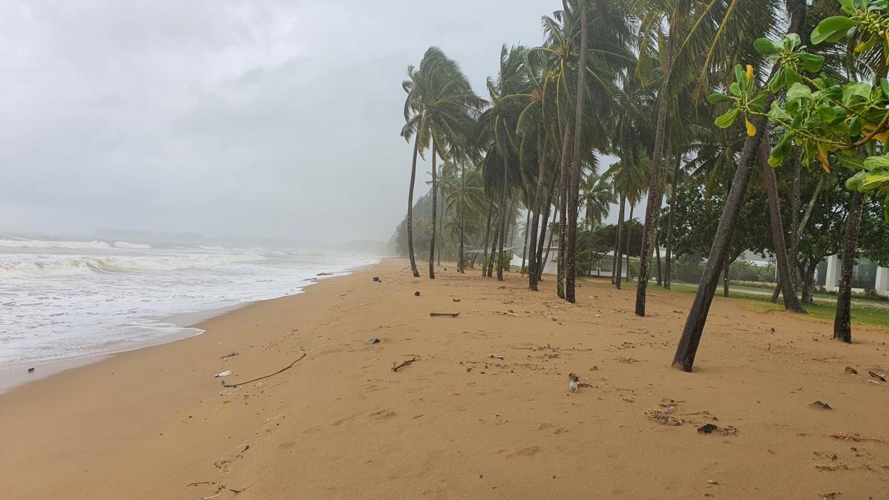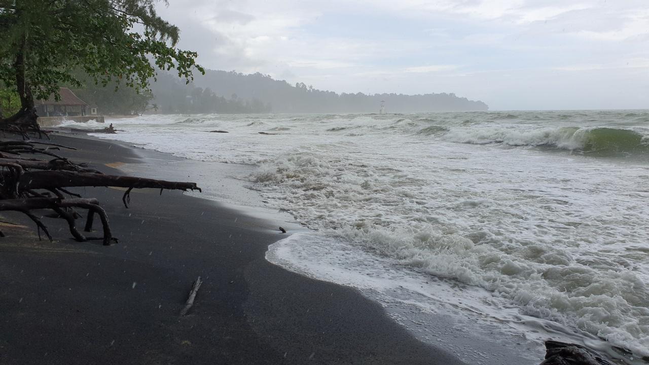 วันที่ 10 ก.ค. 2564 ผู้สื่อข่าวรายงาน บรรยากาศที่บ้านบางหลาโอน หมู่ 7 ต.คึกคัก อ.ตะกั่วป่า จ.พังงา มีฝนตกหนักและลมกระโชกแรงตลอดทั้งวัน ขณะที่บริเวณชายหาดนางทอง แหล่งท่องเที่ยวที่นักท่องเที่ยวนิยมมาพักผ่อนกันจำนวนมาก พบว่าคลื่นลมในทะเลมีกำลังแรงความสูงของคลื่น 2-3 เมตร น้ำทะเลมีสีขุ่นแดง ไม่สามารถลงเล่นน้ำทะเลได้