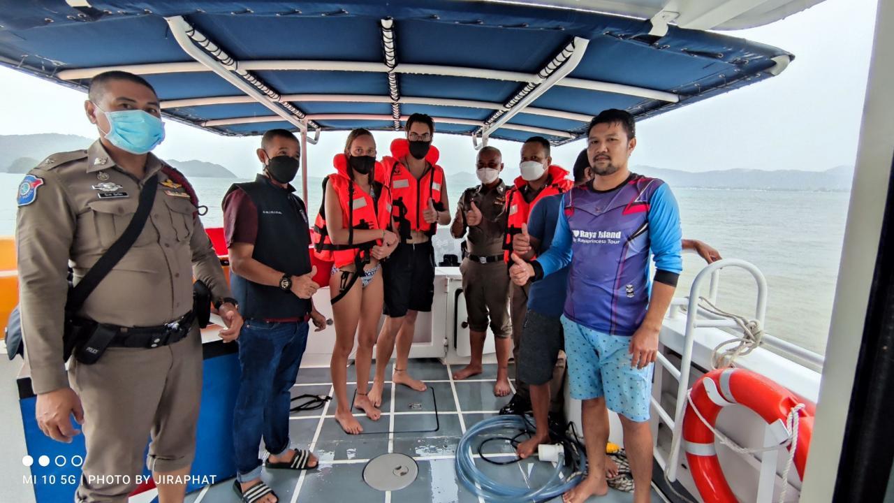 จากนั้น ร.ต.ท.ลิขิต สังขารา ร.ต.ต.นิเวช นิลวัตร รอง สว.ส.ทท.1 กก.2 บก.ทท.3 พร้อมด้วย ด.ต.จิรภัทร นาวาทอง ด.ต.พยงค์ ทิพย์สมบัติ ผบ.งาน ป.ส.ทท.1 กก.2 บก.ทท.3 นำกำลังอาสาสมัครตำรวจท่องเที่ยวนำเรือตรวจการณ์ตำรวจท่องเที่ยว โดยได้ค้นหาและพบกับนักท่องเที่ยวทั้ง 2 ปลอดภัย จึงได้ให้การช่วยเหลือนำนักท่องเที่ยวกลับเข้าฝั่งได้อย่างปลอดภัย ซึ่งไม่ได้รับบาดเจ็บแต่อย่างใด จากนั้นได้นำนักท่องเที่ยวกลับเข้าฝั่งพร้อมกับนำส่งที่พัก โดยนักท่องเที่ยวได้ขอบคุณและประทับใจการปฏิบัติหน้าที่ของเจ้าหน้าที่ในการให้ความช่วยเหลือเป็นอย่างดียิ่ง โดยนักท่องเที่ยวทั้ง 2 เข้ามาเที่ยวประเทศไทยครั้งแรก โดยเดินทางมาตามโครงการ Phuket Sandbox เมื่อวันที่ 24 ก.ค.ที่ผ่านมา.