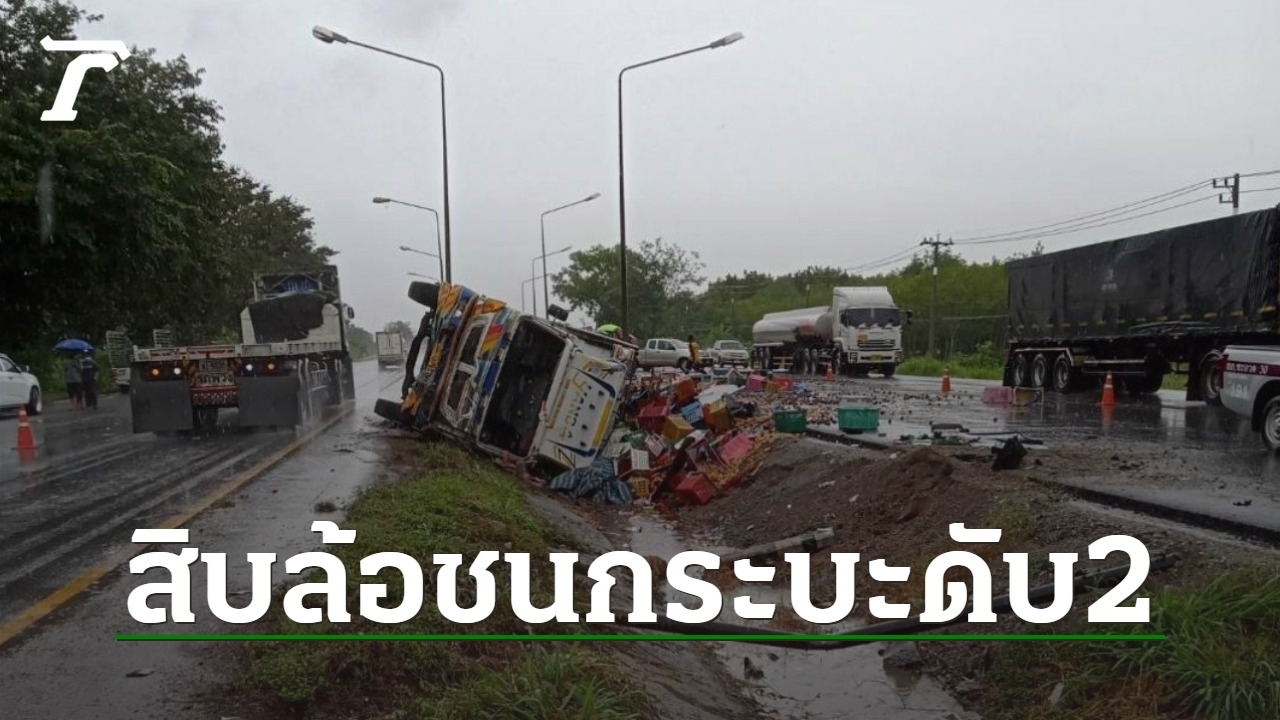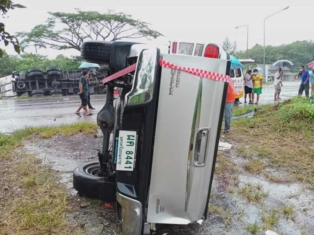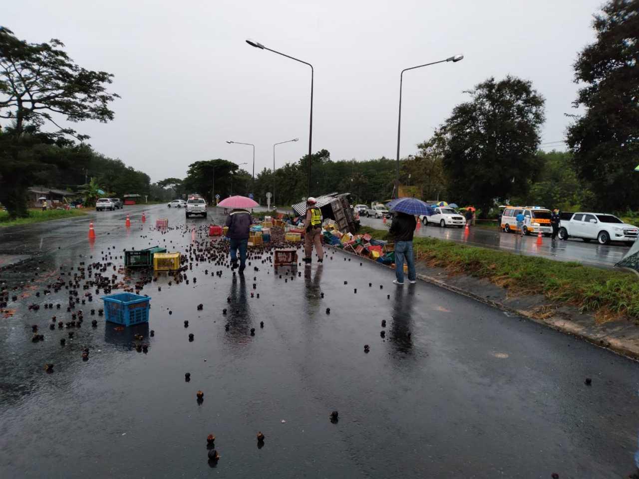 กระบะลุงป้าออกถนนใหญ่ไม่ระวัง เจอรถบรรทุกสิบล้อขนผลไม้มาเร็วเบรกไม่ทัน ชนกระเด็นจนทั้ง 2 คันพลิกคว่ำคายูเทิร์น สามแยกบ้านทุ่งไม้ไผ่ อ.ชะอวด ลุงป้าตายคาที่ ส่วนคู่กรณีเจ็บ 2 ราย ส่ง รพ.แล้ว