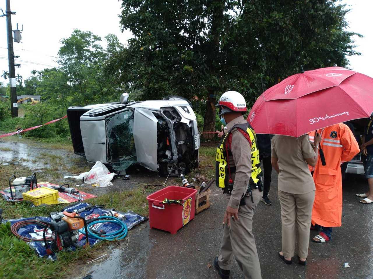 ห่างกันไม่มากนัก ที่ข้างถนนพบรถยนต์กระบะตอนครึ่ง อีซูซุ สีขาว ทะเบียน ผค 8441 นครศรีธรรมราช พลิกคว่ำอยู่ข้างถนน สภาพรถพังยับ มีผู้เสียชีวิตภายในรถ 2 ศพ ศพแรกเป็นคนขับ ทราบชื่อคือนายสาธร อ้นประวัติ อายุ 64 ปี ชาวบ้าน ต.เขาพระทอง อ.ชะอวด จ.นครศรีธรรมราช เจ้าของสวนยางพาราใน อ.ชะอวด สภาพศพกะโหลกร้าว หน้าอกยุบ และคนนั่งข้าง คือ นางสมพงศ์ อ้นประวัติ อายุ 64 ปี ภรรยาของนายสาธร กะโหลกร้าว ไหปลาร้าหัก ทั้งสองศพถูกอัดติดก๊อปปี้อยู่ในรถ เจ้าหน้าที่กู้ภัยต้องใช้เครื่องตัดถ่าง กันพักใหญ่ กว่าจะสามารถนำศพสองผัวเมียออกมาจากซากรถได้