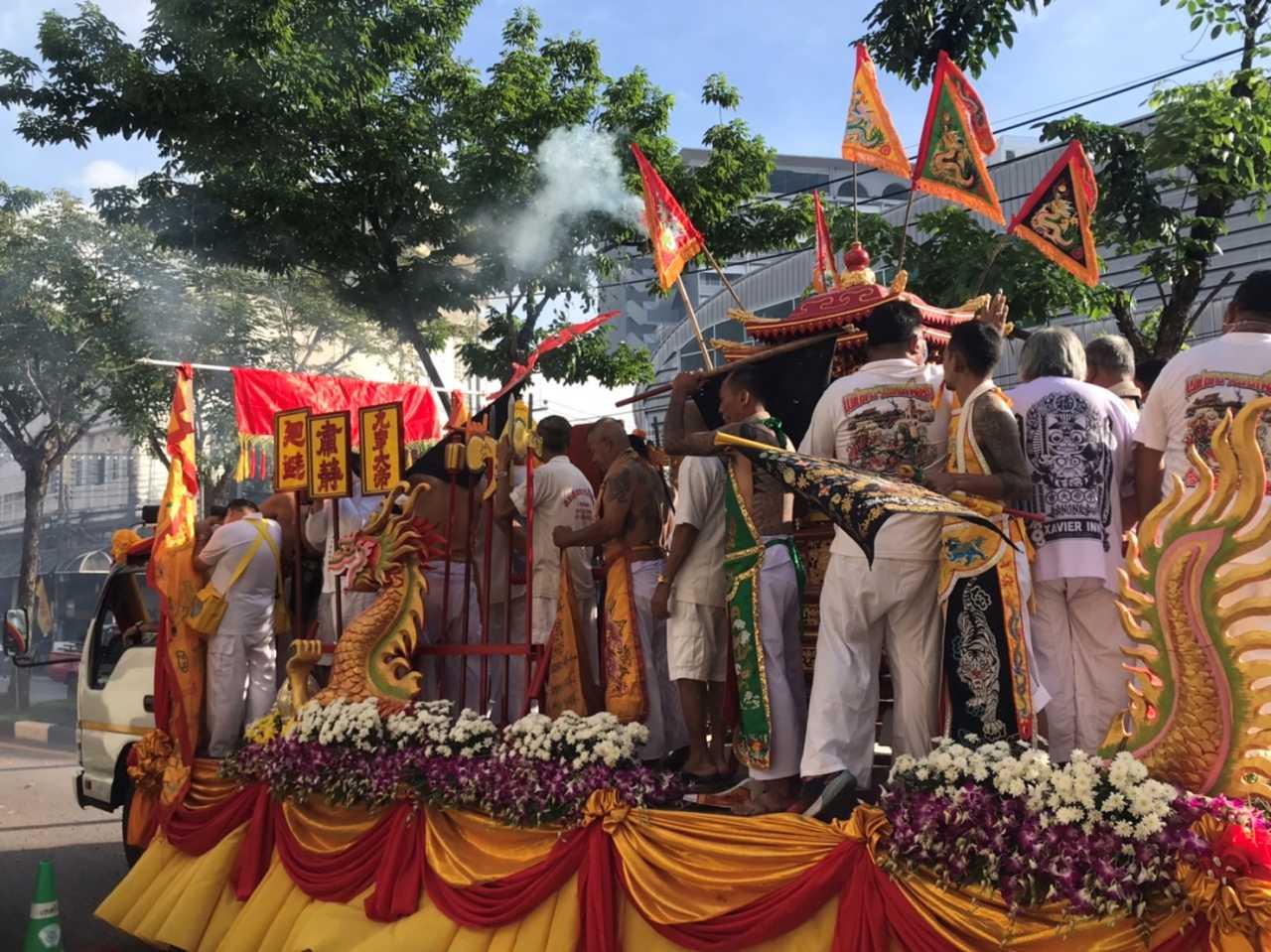 พิธีอิ้วเก้ง ขบวนรถยนต์ศาลเจ้าบางเหนียว อ๊ามเก่าแก่แห่พระรอบเมืองภูเก็ตในวันที่ 5 ปชช.นุ่งขาวรอรับพระมากกว่าปกติ เนื่องจากฟ้าเปิดไม่มีฝน ส่วนบรรดาม้าทรงลดจำนวนลง งดเว้นอาวุธทิ่มแทงร่างกาย