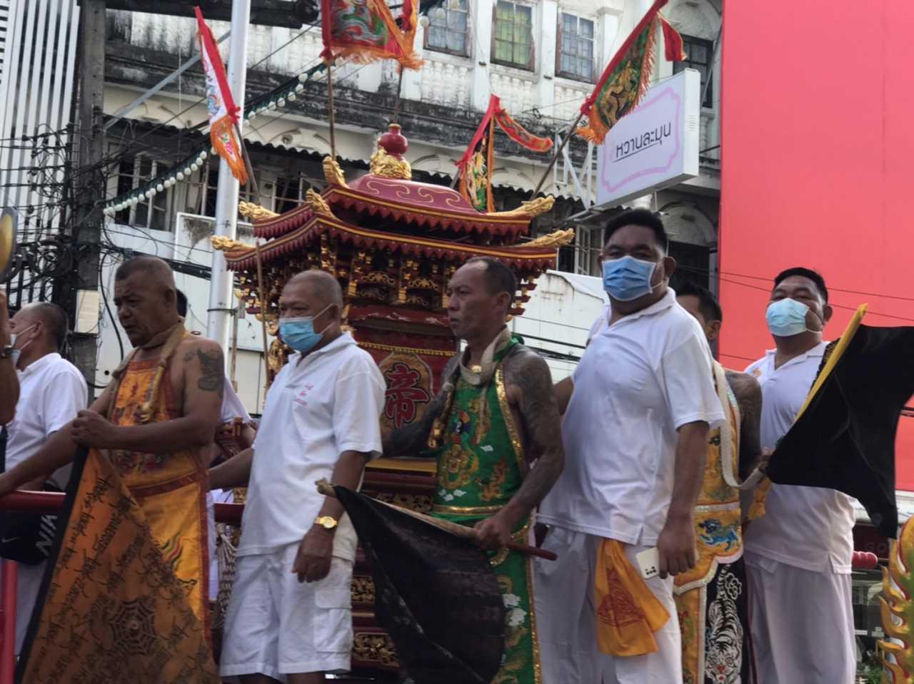 นอกจากนั้นปีนี้เหล่าม้าทรงที่ทุกปีจะมีนับร้อยคนและใช้อาวุธชนิดต่างๆ ทิ่มแทงตามร่างกายถูกงดและลดจำนวนม้าทรงลง มีเพียงการประทับทรงจำนวนหนึ่งเท่านั้น โดยในขบวนพี่เลี้ยงม้าทรงและผู้ร่วมขบวนมีการสวมหน้ากากอนามัยตลอดเวลาตามมาตรการคุมเข้มการแพร่ระบาดของโควิด-19 ของ จ.ภูเก็ต อย่างไรก็ดีในวันที่ 12 ต.ค. ซึ่งเป็นวันที่ 7 ของประเพณีถือศีลกินผักประจำปี และเป็นวันที่ 6 ของการประกอบพิธีแห่พระรอบเมือง หรือ อิ้วเก้ง ของศาลเจ้าจุ้ยตุ่ยเต้าโบเก้ง ซ.ภูธร อ.เมือง ซึ่งถือว่าเป็นศาลเจ้าเก่าแก่และใหญ่ที่สุดใน จ.ภูเก็ต