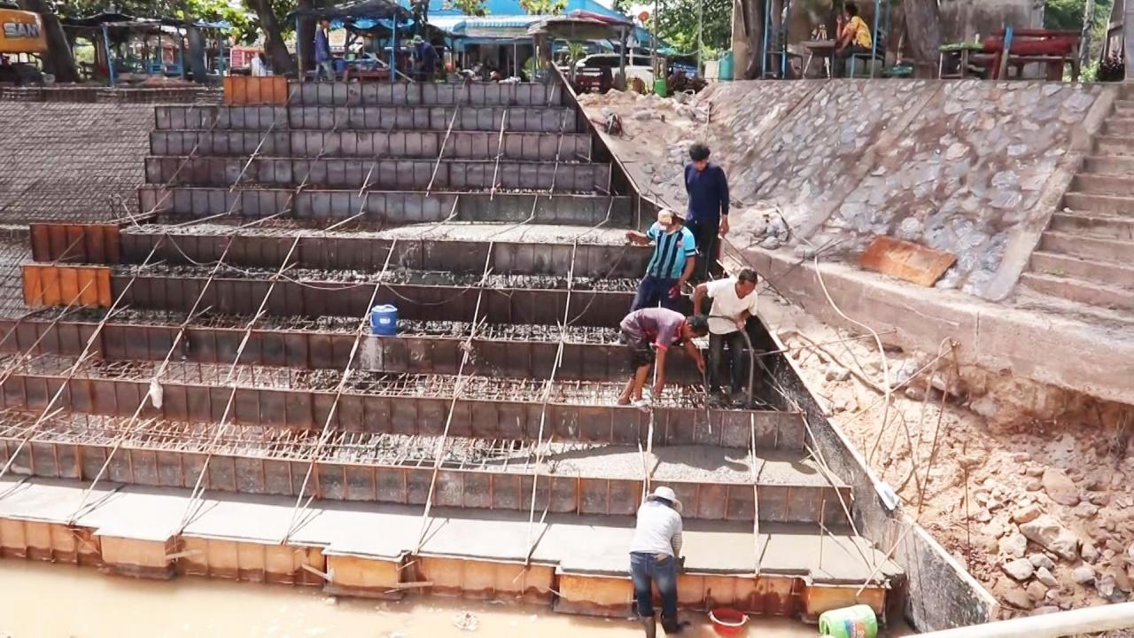 "การก่อสร้างเป็นลักษณะของขั้นบันได ประมาณ 10 ขั้น ยื่นลงไปบนชายหาด โดยขั้นบันไดประมาณ 2-3 ขั้นสุดท้าย เมื่อสร้างแนวเขื่อนป้องกันตลิ่งริมทะเลเสร็จเรียบร้อยแล้ว มีการปรับชายหาดให้เหมือนเดิม บันได 2-3 ขั้นก็จะถูกฝังลงในทราย เมื่อถึงฤดูกาลที่น้ำทะเลลงก็จะเห็นขั้นบันไดที่ถูกทรายฝั่งไว้ โครงการนี้นอกเหนือจากทำแนวกันคลื่นป้องกันตลิ่งพังแล้ว ยังเป็นการปรับปรุงภูมิทัศน์บริเวณแนวชายหาดด้วย มีการปูตัวหนอนเป็นทางเดินให้นักท่องเที่ยวได้เดินเล่นให้ชาวบ้านได้ออกกำลังกาย เป็นความกว้างประมาณ 5 เมตร ตลอดแนวชายฝั่ง"