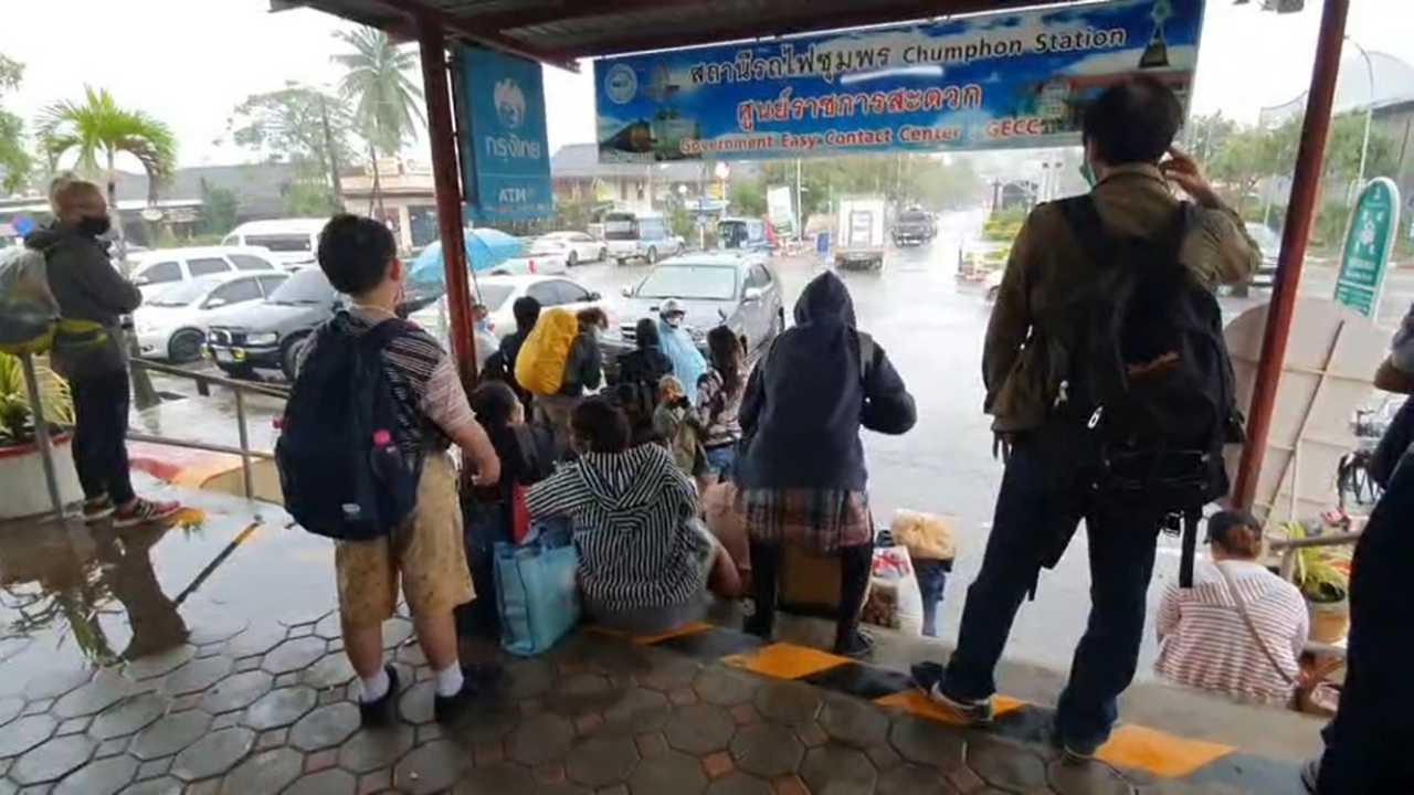 ขณะที่ฝ่ายประชาสมพันธ์ของสถานีรถไฟชุมพร ประกาศด่วน เนื่องจากมีน้ำท่วมบนทางรางรถไฟ การรถไฟ จึงมีความจำเป็นต้องประกาศปิดทางในเส้นทางสายใต้ ช่วงระหว่างสถานีสวี - เขาสวนทุเรียน เพื่อให้เหมาะสมกับสถานการณ์และความปลอดภัยในการเดินทางของผู้โดยสาร ตั้งแต่วันที่ 12 พฤศจิกายน 2564 เวลา 20.25 น. เป็นต้นไป นอกจากนี้ยังมีมวลน้ำไหลท่วมถนนเพชรเกษม ทำให้ไม่สามารถขนถ่ายผู้โดยสารทางรถยนต์ได้ จากเหตุการณ์ดังกล่าวส่งผลกระทบผู้โดยสารที่เดินทางมากับขบวนรถในเส้นทางสายใต้ ต้องหยุดรอการเปิดทาง จำนวน 8 ขบวน ดังนี้
