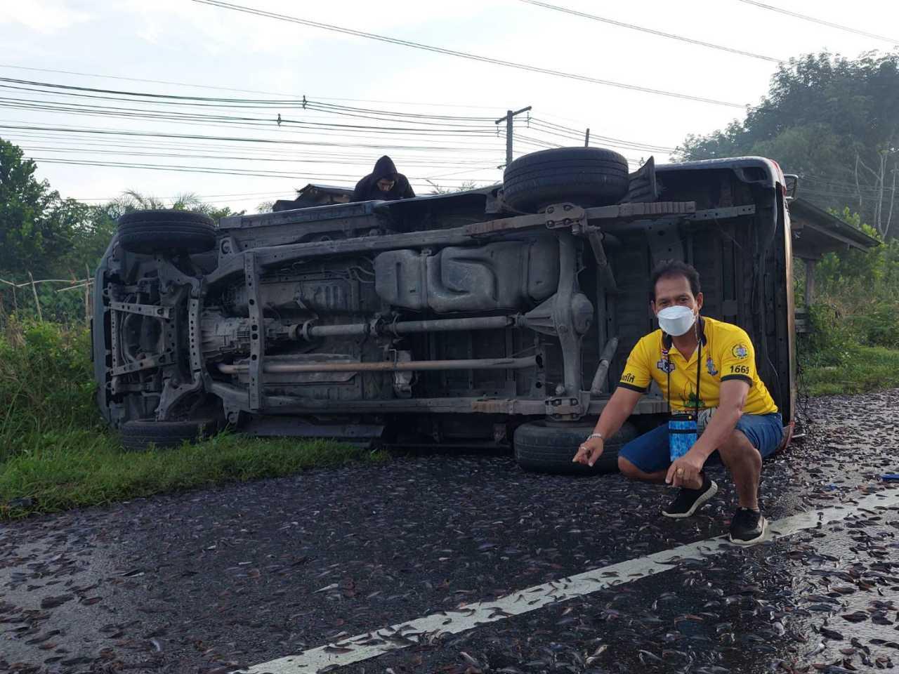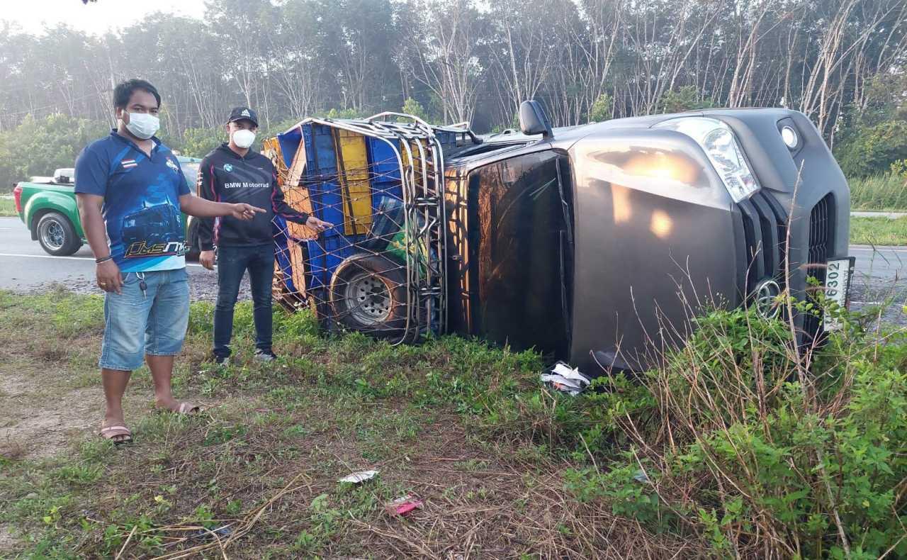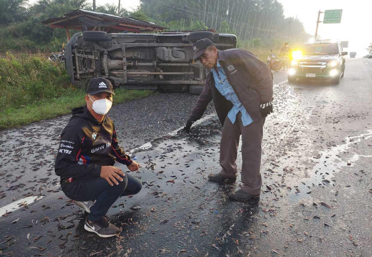 เมื่อเวลา 05.40 น. วันที่ 7 ธ.ค. 64 เจ้าหน้าที่กู้ภัยมูลนิธิสยามรวมใจปู่อินทร์ทุ่งใหญ่ จ.นครศรีธรรมราช พร้อมศรชัย รถยก รับแจ้งเกิดอุบัติเหตุรถกระบะพลิกคว่ำอยู่ข้างทาง เหตุเกิดบนถนนสายเอเชียฝั่งขาล่องเข้า อ.ทุ่งสง หมู่ 7 ต.ปริก ใกล้ป้อมสายตรวจควนลำภู หลังรับแจ้งออกไปตรวจสอบพบกระบะโตโยต้า รุ่นไฮลักซ์วีโก้แชมป์ แบบตอนครึ่ง สีบรอนซ์เทา ทะเบียน ผฉ 6302 นครศรีธรรมราช ท้ายกระบะติดรั้วเหล็กพลิกตะแคงอยู่ข้างทาง ลูกพันธุ์ปลาดุกตัวเล็กนับแสนตัวตกกระจายเกลื่อนถนน เจ้าหน้าที่กู้ภัยต้องนำรถมาปิดหัวปิดท้ายเปิดสัญญาณไซเรน ป้องกันการเกิดอุบัติเหตุซ้ำซ้อน