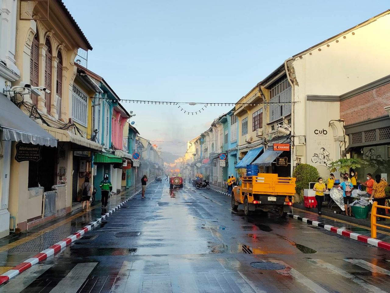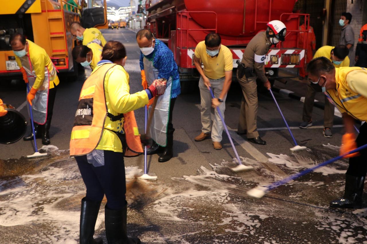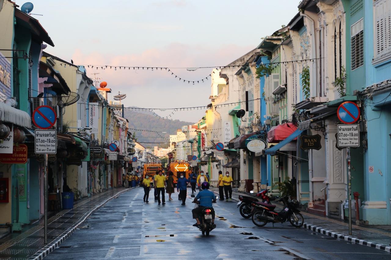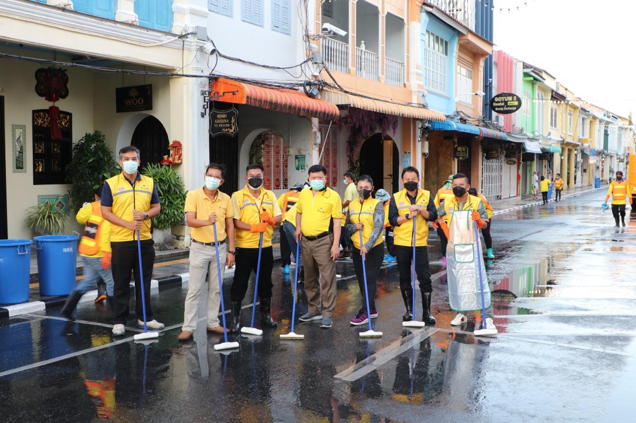 โดยบริเวณชุมชนย่านเมืองเก่า อ.เมืองภูเก็ต นายณรงค์ วุ่นซิ้ว ผู้ว่าราชการจังหวัดภูเก็ต พร้อมด้วยผู้ประกอบการย่านชุมชนเมืองเก่าภูเก็ตร่วมกันล้างทำความสะอาดทางเท้าและถนน พร้อมฉีดพ่นสารฆ่าเชื้อน้ำผสมคลอรีนฉีดพ่นทำความสะอาดบริเวณถนนถลาง ตั้งแต่สี่แยกแถวน้ำ-สี่แยกถนนถลางตัดถนนเยาวราช ระยะทางราว 350 เมตร ซึ่งเป็นแหล่งท่องเที่ยวที่ต้อนรับนักท่องเที่ยวมาเที่ยวชมความงามของอาคารสถาปัตยกรรมชิโนโปรตุกีส สัมผัสวิถีชีวิตย่านเมืองเก่า อัตลักษณ์ของชาวภูเก็ต