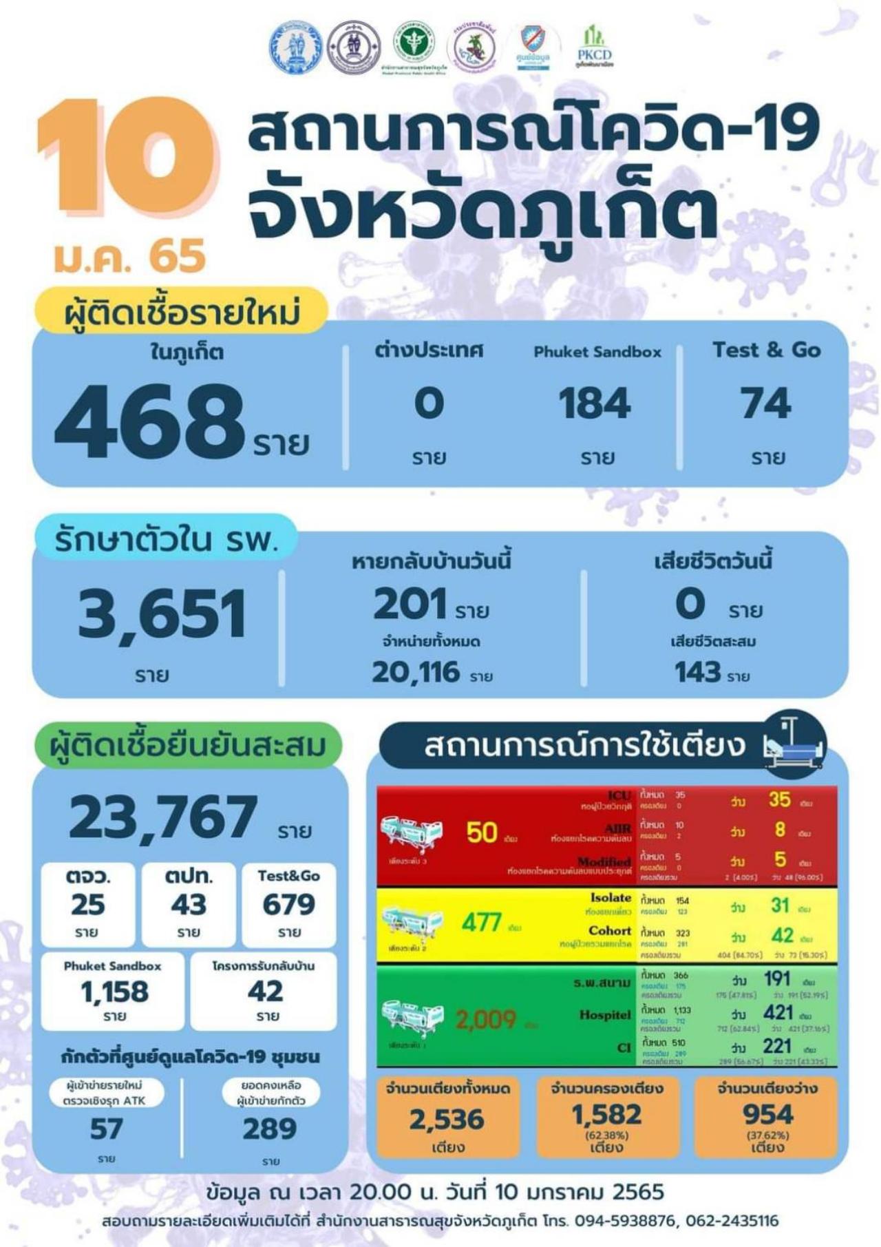 วันที่ 9 ม.ค. 65 พบผู้ติดเชื้อรวม 742 ราย แบ่งเป็น พบผู้ติดเชื้อภายในจังหวัด 513 ราย ผู้ติดเชื้อจากต่างประเทศ 2 ราย ผู้ติดเชื้อในโครงการภูเก็ตแซนด์บ็อกซ์ 133 ราย และผู้ติดเชื้อจากเทสต์แอนด์โก 94 ราย และวันที่ 10 ม.ค. 65 พบผู้ติดเชื้อรวม 726 ราย แบ่งเป็นผู้ติดเชื้อภายในจังหวัด 468 ราย ไม่มีผู้ติดเชื้อจากต่างประเทศ ผู้ติดเชื้อในโครงการภูเก็ตแซนด์บ็อกซ์ 184 รายและผู้ติดเชื้อจากเทสต์แอนด์โก 74 ราย