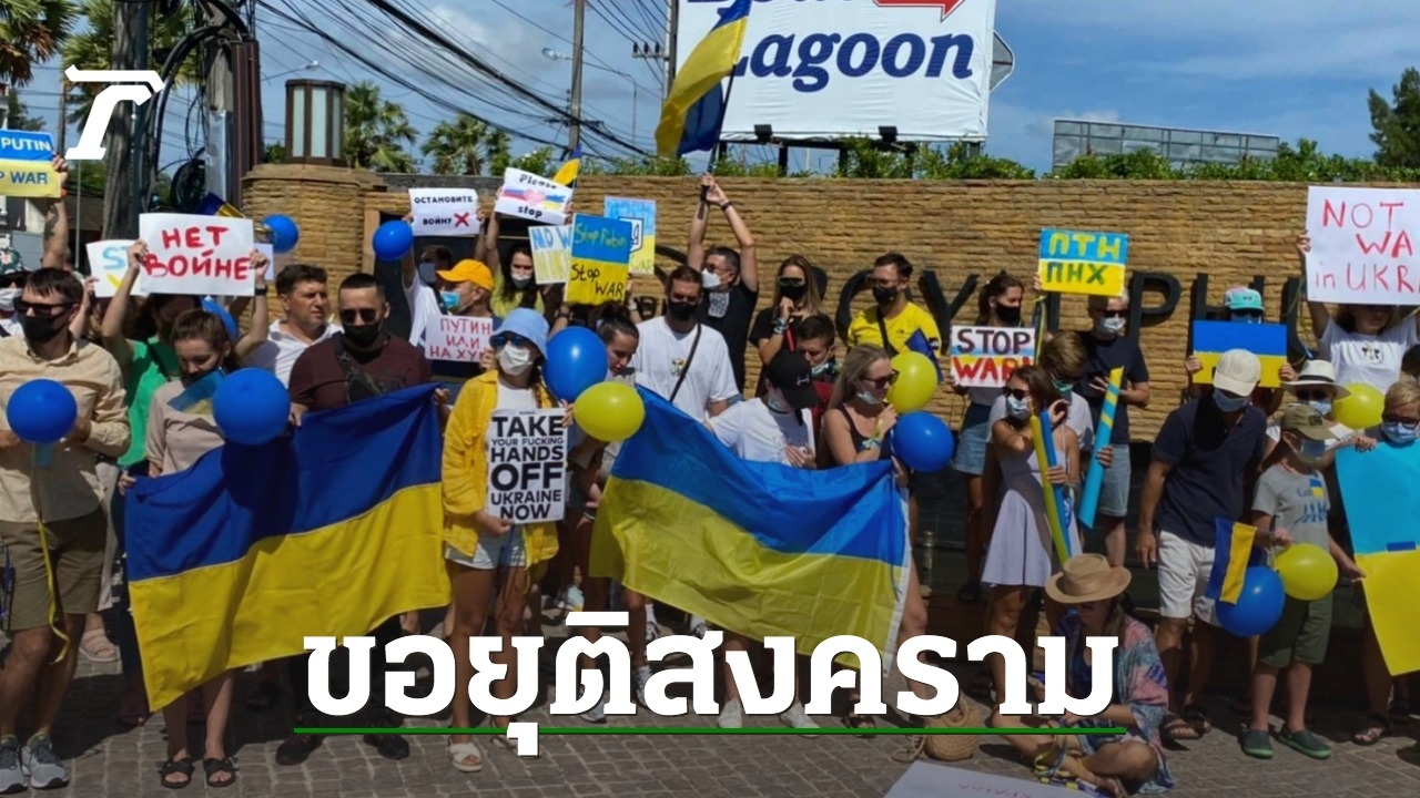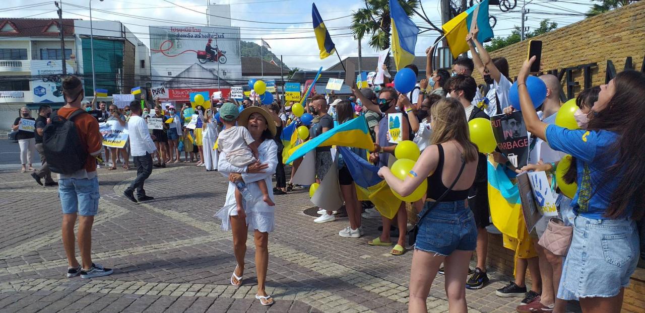 นทท.ชาวยูเครนและรัสเซีย ในจังหวัดภูเก็ต จับมือทำกิจกรรมประท้วง และเรียกร้องให้ยุติการทำสงคราม และหยุดฆ่าคนบริสุทธิ์ในยูเครน ที่หน้ากงสุลรัสเซีย