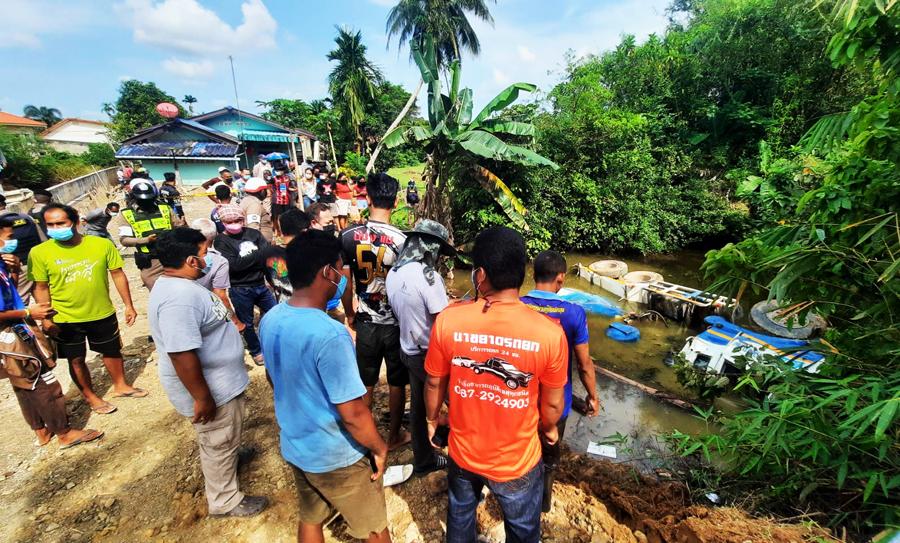 ในที่เกิดเหตุ ตร.พบรถโม่ปูนนิสสัน 10 ล้อ ทะเบียน 70-4275 สงขลา ของบริษัทแสงทองขนส่งภาคใต้ เสียหลักพลิกคว่ำ 2 ตลบ ตกลงไปในบ่อปลาของชาวบ้านรายหนึ่งในหมู่บ้านดังกล่าว ส่วนคนขับทราบชื่อในเบื้องต้นว่า นายสมภพ ชูปาน อายุ 47 ปี เป็นชาวบ้าน ต.ท่าแค อ.เมืองพัทลุง โดยสภาพศพถูกฝังดินอยู่ในโคลนทางด้านประตูหน้าด้านขวาของบ่อปลาดังกล่าว โดยมีมือโผล่ขึ้นมาจากโคลน ขณะนี้ยังไม่สามารถนำศพออกจากใต้โคลนได้ ยังต้องรอรถมาลากรถโม่ปูนขึ้นจากบ่อปลา เพื่อให้ จนท.หน่วยกู้ภัยฯช่วยกันเคลื่อนย้ายศพขึ้นจากโคลนต่อไป