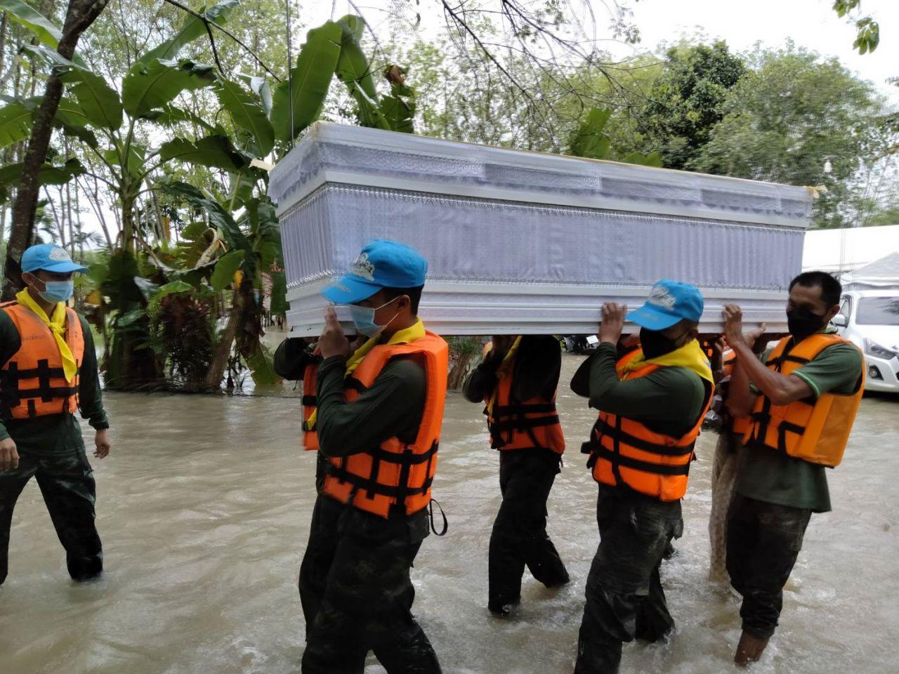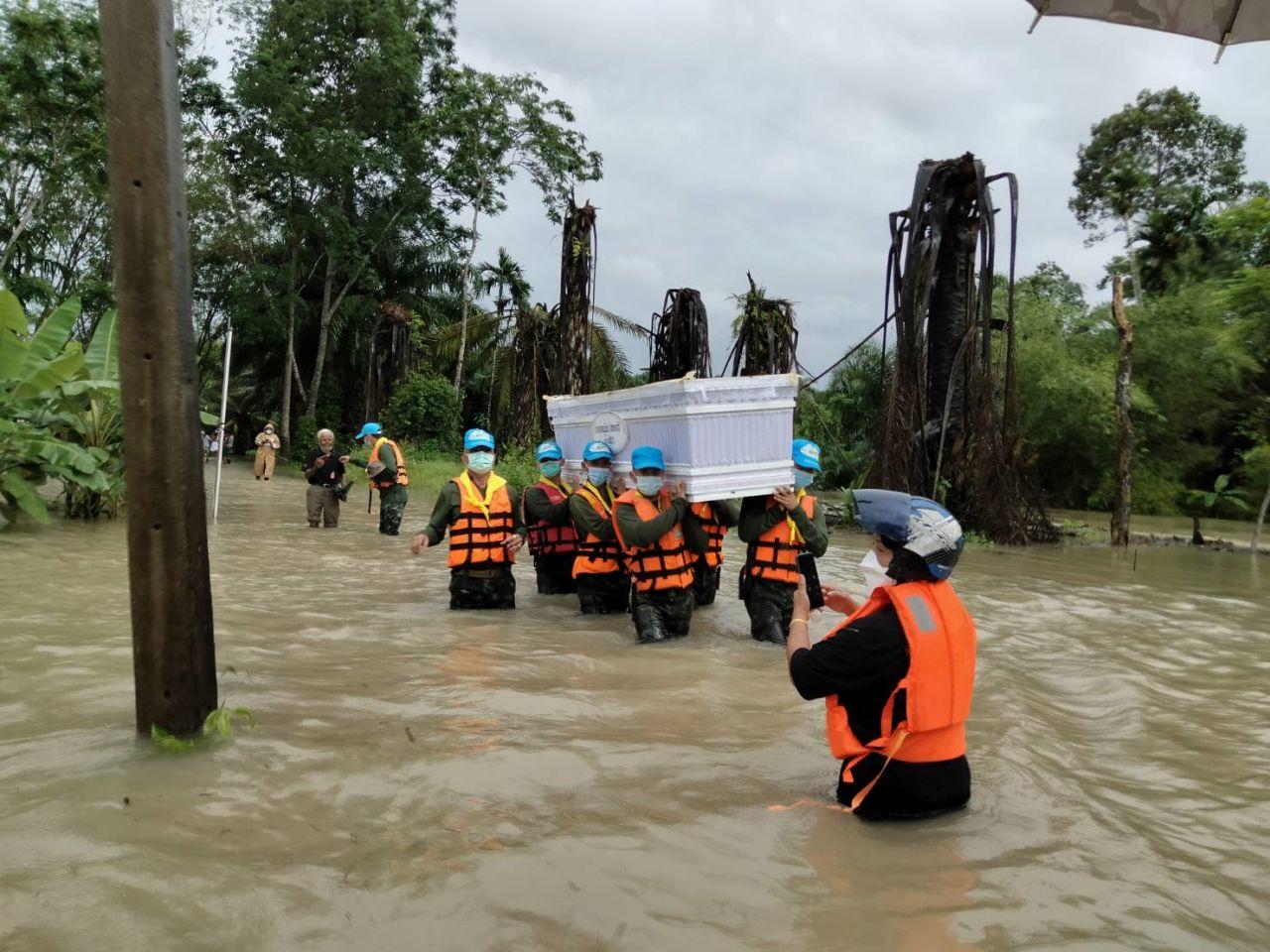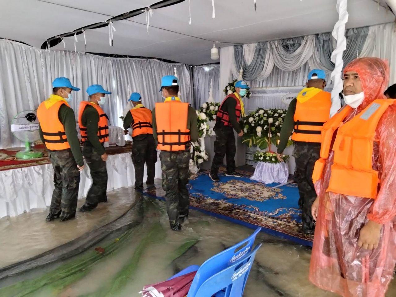 กำลังทหารทั้งหมดได้เดินลุยน้ำไปจนถึงบ้านจัดงานศพ ระยะทางกว่า 300 เมตร เนื่องจากน้ำท่วมทางเข้า ก่อนช่วยกันแบกหามโลงศพออกมาอย่างทุลักทะเล ฝ่ากระแสน้ำที่ท่วมสูงออกมาปากทางแล้วนำขึ้นรถยนต์ทหารย้ายไปจัดงานศพที่วัดนาแล ตำบลเดียวกัน เนื่องจากอยู่ในที่สูง ปลอดภัย ไม่ถูกน้ำท่วม ห่างจากบ้านที่เกิดน้ำท่วมประมาณ 2 กม. ท่ามกลางความดีใจของญาติที่ทหารเข้ามาช่วยย้ายโลงศพในครั้งนี้.