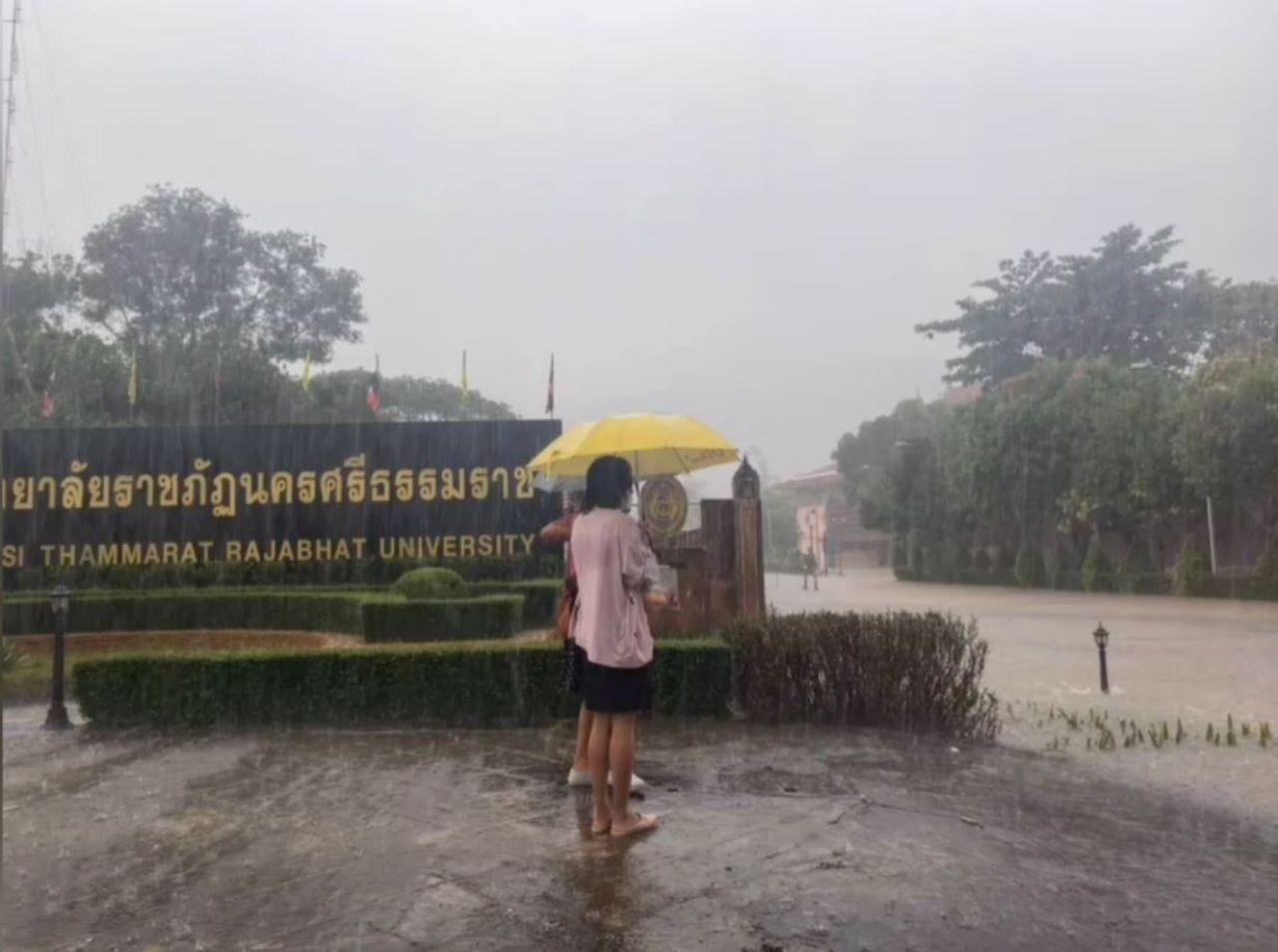 เมื่อวันที่ 5 เม.ย.2565 ผู้สื่อข่าวรายงานว่า ช่วงเช้าที่ผ่านมา หลังเกิดฝนตกหนักติดต่อกัน 3 วัน 3 คืน ส่งผลให้เกิดน้ำท่วมบ้านเรือนประชาชน เรือกสวน ไร่นา ถนน สะพาน โดยเฉพาะที่มหาวิทยาลัยราชภัฏนครศรีธรรมราช ต.ท่างิ้ว อ.เมืองนครศรีธรรมราช ช่วงเช้าวันนี้ เกิดน้ำท่วมในมหาวิทยาลัย ระดับน้ำสูง 10 – 20 เซนติเมตร สร้างความเดือดร้อนให้กับอาจารย์ ครู รวมทั้งเจ้าหน้าที่มหาวิทยาลัยฯ จนทางมหาวิทยาลัยต้องสั่งปิดมหาวิทยาลัย 1 วัน เนื่องจากไม่สามารถเข้าไปภายในมหาวิทยาลัยได้ ขณะที่เจ้าหน้าที่ รปภ.มหาวิทยาลัย นำแผงเหล็กกั้น ห้ามรถสัญจรเข้าภายในมหาวิทยาลัยฯ เนื่องจากมีน้ำท่วมขังภายใน สถาบันฯ หลายจุด