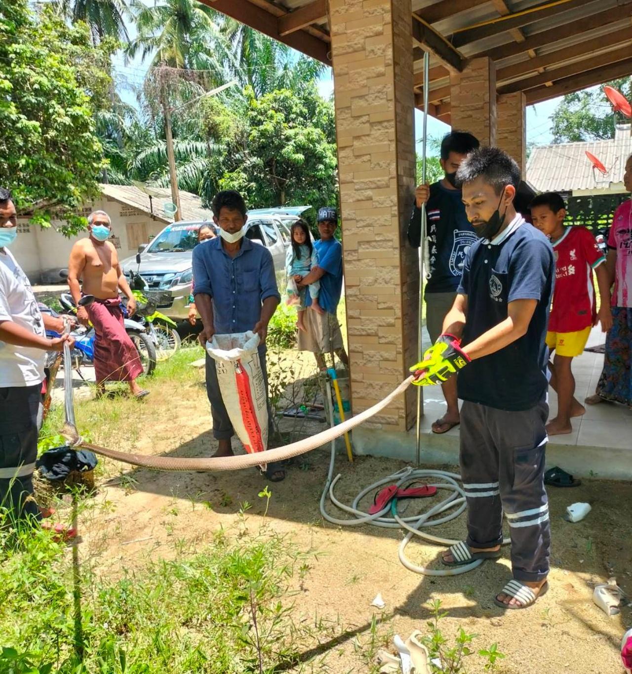 วันที่ 7 เม.ย. 65 เจ้าหน้าที่ชุดเฉพาะกิจอาสาสมัครมูลนิธิประชาร่วมใจท่าศาลา จ.นครศรีธรรมราช รับแจ้งขอความช่วยเหลือ เหตุมีงูซุกอยู่ในชักโครกห้องน้ำ ภายในบ้านเลขที่ 7/11 ซอยหน้าทัพ 1 หมู่ 7 ต.ท่าศาลา อ.ท่าศาลา จึงนำเจ้าหน้าที่ไปตรวจสอบ
