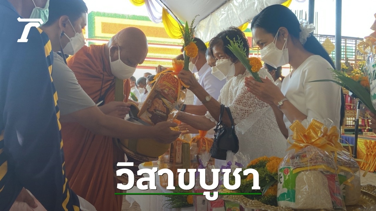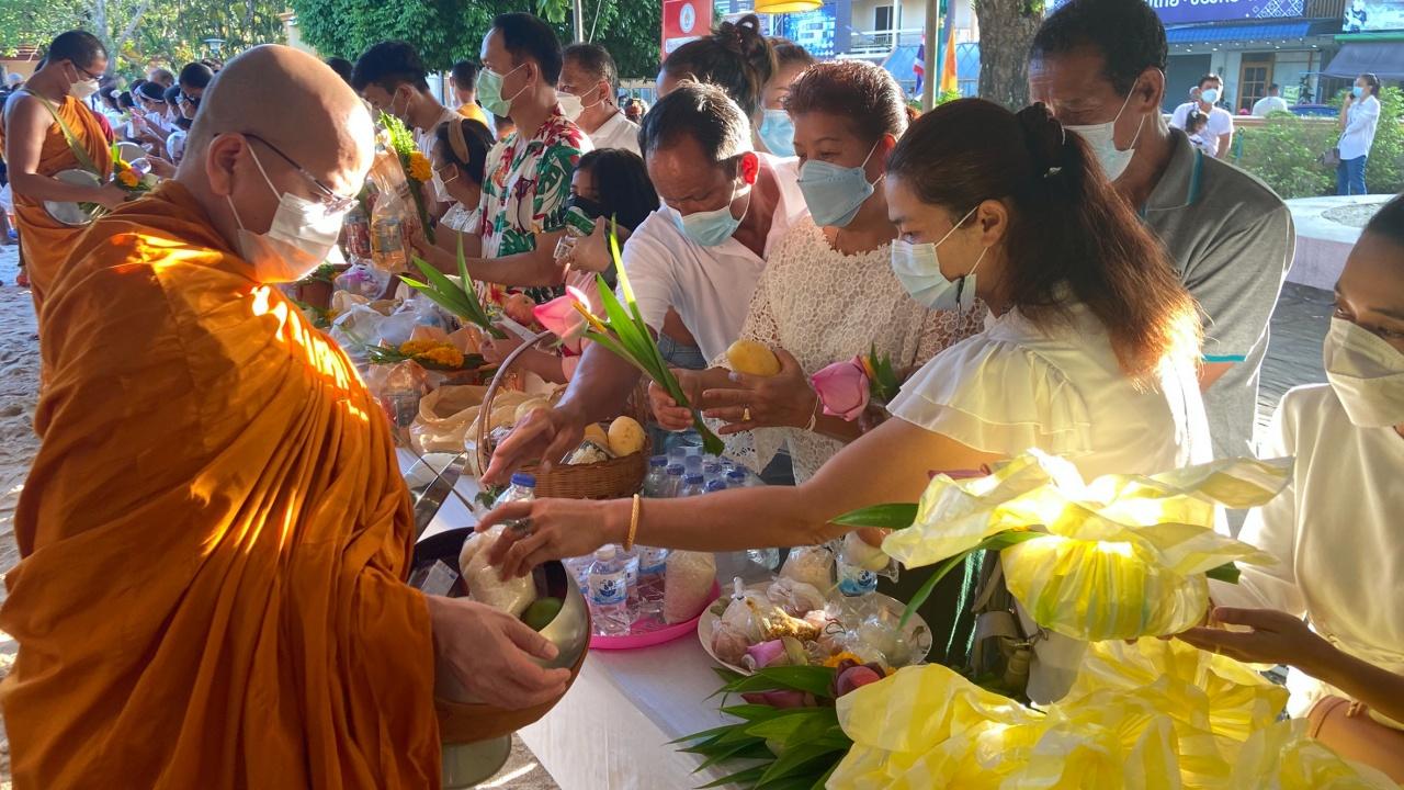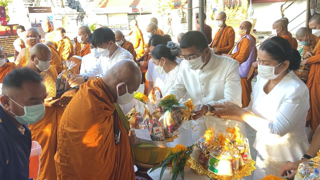 โดยที่ลานโพธิ์ วัดพระมหาธาตุวรมหาวิหาร อ.เมือง จ.นครศรีธรรมราช นายไกรศร วิศิษฎ์วงศ์ ผู้ว่าราชการจังหวัด พร้อมส่วนราชการ พร้อมชาวพุทธจำนวนมาก พร้อมใจกันแต่งกายด้วยชุดเสื้อผ้าสีขาว ร่วมทำบุญตักบาตรข้าวสารอาหารแห้งแด่พระสงฆ์ จำนวน 50 รูป เพื่อถวายเป็นพุทธบูชา และความเป็นสิริมงคล ภายใต้มาตรการป้องกันการแพร่ระบาดของโรคโควิด-19 อย่างเข้มงวด