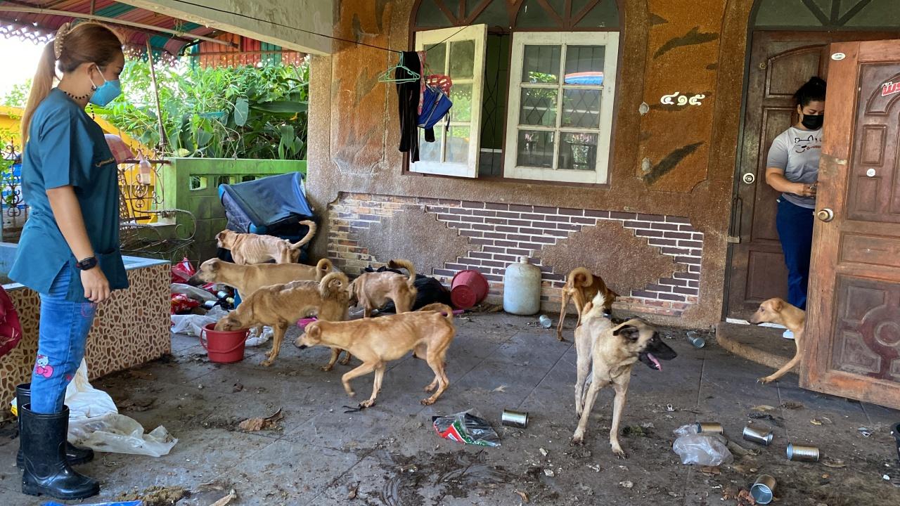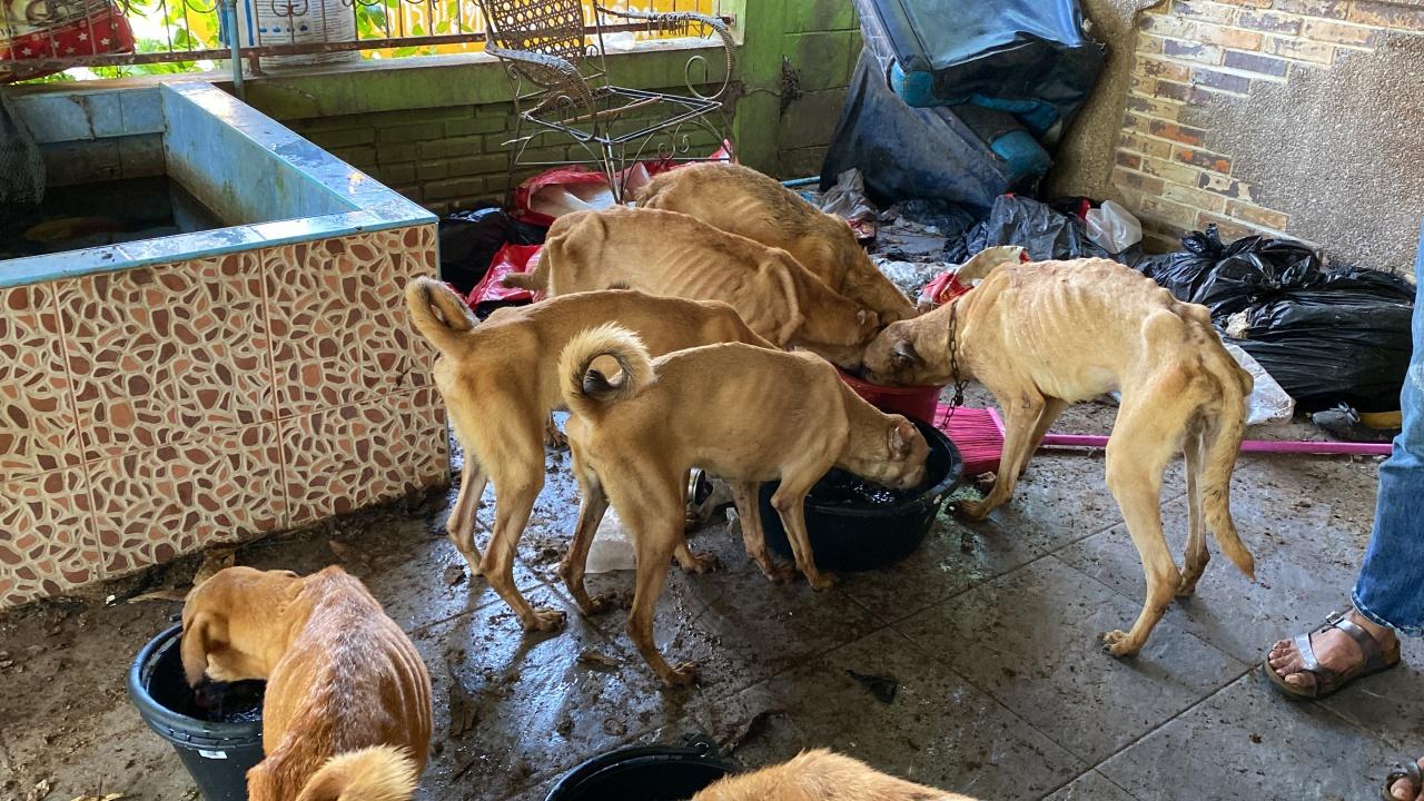 จากการเข้าตรวจสอบภายในบ้านหลังนี้พบฝูงสุนัขจำนวน 15 ตัว ทั้งที่อยู่นอกบ้านและถูกขังไว้ภายในบ้าน ซึ่งทุกตัวอยู่ในสภาพที่ขาดน้ำขาดอาหารอย่างรุนแรงและป่วยมาเป็นเดือนๆ บางตัวผอมแห้งเห็นกระดูกแทบเดินไม่ได้ ส่งเสียงร้องกันระงม และสภาพบริเวณบ้านก็เต็มไปด้วยสิ่งปฏิกูลกลิ่นเหม็น และขนสุนัขที่นอนแห้งตายและถูกสุนัขพวกเดียวกันรุมกันแทะเล็มเนื้อกินด้วยความหิว เบื้องต้นทางเจ้าหน้าที่ได้ทำการคัดแยกสุนัขทั้ง 15 ตัว โดยเฉพาะตัวที่ป่วยผอมแห้งนำออกมาให้นำเกลือให้น้ำให้อาหาร และบางตัวที่ค่อนข้างดุชอบกัดพวกเดียวกันก็นำออกมาล่ามไว้ข้างนอก ซึ่งขณะที่เจ้าหน้าที่เข้าไปช่วยเหลือนั้นสุนัขทุกตัวต่างหิวโหยและแย่งกันกินน้ำกินอาหารที่เจ้าหน้าที่นำไปให้