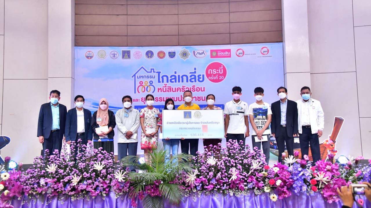 เมื่อวันที่ 4 มิ.ย.65 ที่องค์การบริหารส่วนจังหวัดกระบี่ มีการจัดงานมหกรรมไกล่เกลี่ยหนี้สินครัวเรือน และยุติธรรมพบประชาชน ครั้งที่ 20 จ.กระบี่ โดยมี นายสมศักดิ์ เทพสุทิน รมว.ยุติธรรม เป็นประธานเปิดงาน พร้อมด้วย นายอนุวรรตน์ โหมดพริ้ง รองผู้ว่าราชการจังหวัดกระบี่ นายสหการณ์ เพ็ชรนรินทร์ รองปลัดกระทรวงยุติธรรม นายสมศักดิ์ กิตติธรกุล นายก อบจ.กระบี่ น.ส.รวิวรรณ์ ศรีวนาภิรมย์ ผู้ตรวจราชการกระทรวงยุติธรรม นายเรืองศักดิ์ สุวารี อธิบดีกรมคุ้มครองสิทธิและเสรีภาพ นางทัศนีย์ เปาอินทร์ อธิบดีกรมบังคับคดี นายไตรยฤทธิ์ เตมหิวงศ์ อธิบดีกรมสอบสวนคดีพิเศษ นายนิพันธ์ ศิริธร ส.ส.ตรัง นายนัทธี ถิ่นสาคู นายสุทา ประทีป ณ ถลาง ส.ส.ภูเก็ต นายสายันห์ ยุติธรรม นายอาญาสิทธิ์ ศรีสุวรรณ ส.ส.นครศรีธรรมราช พรรคพลังประชารัฐ ข้าราชการ เจ้าหน้าที่กระทรวงยุติธรรม และประชาชนร่วมงาน โดยก่อนเข้างานมีการคัดกรองโควิด-19 อย่างเข้มงวด
