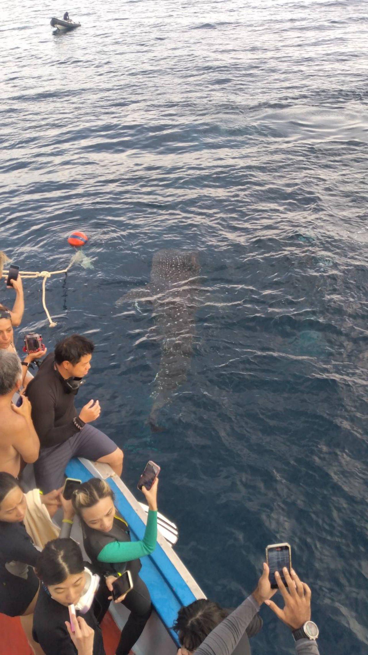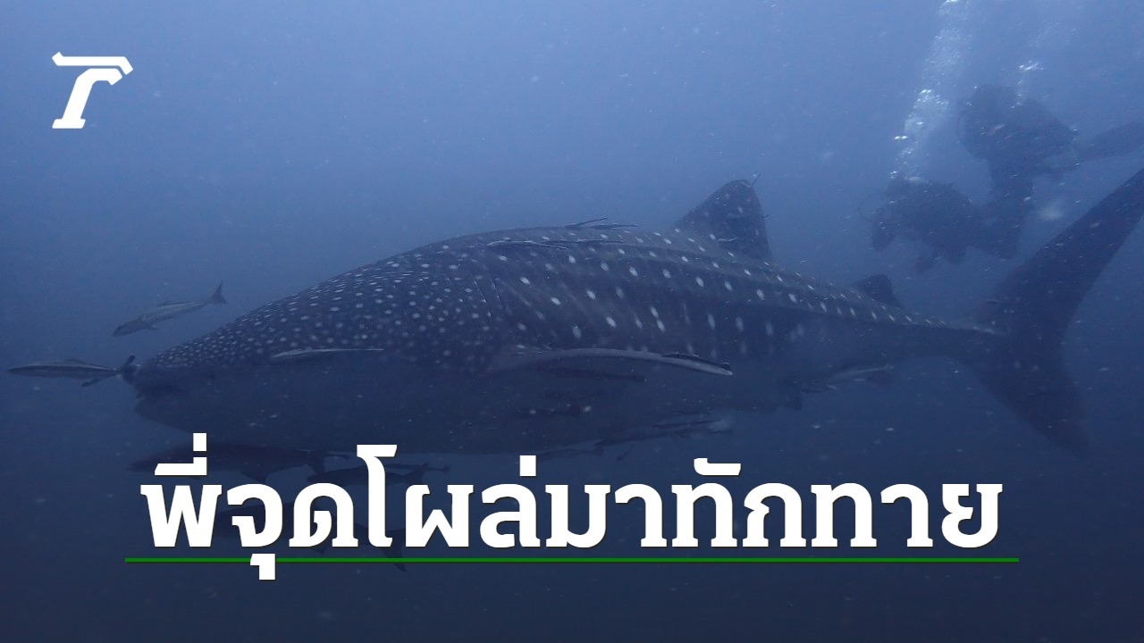 นักท่องเที่ยวลงเรือจะไปดำน้ำชมโลกใต้ทะเลที่เกาะเต่า อ.เกาะพะงัน จ.สุราษฎร์ธานี สุดดีใจ พบ "พี่จุด" ฉลามวาฬตัวใหญ่โผล่มาว่ายน้ำทักทายข้างเรือ เป็นโอกาสดีที่พี่จุดโผล่มาให้เห็นชัดๆ แบบนี้