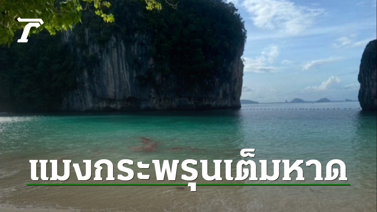 ชายหาดทะเลเกาะ จ.กระบี่ ห้องขึ้นธงแดง ห้ามนักท่องเที่ยวลงเล่นน้ำ หลังพบฝูงแมงกะพรุนไฟโผล่เต็มชายหาด สั่ง จนท.อุทยานฯ เร่งตักแมงกะพรุนออกจากหาด คาด 1-2 วันคลื่นลมสงบแมงกะพรุนจะหมดไป