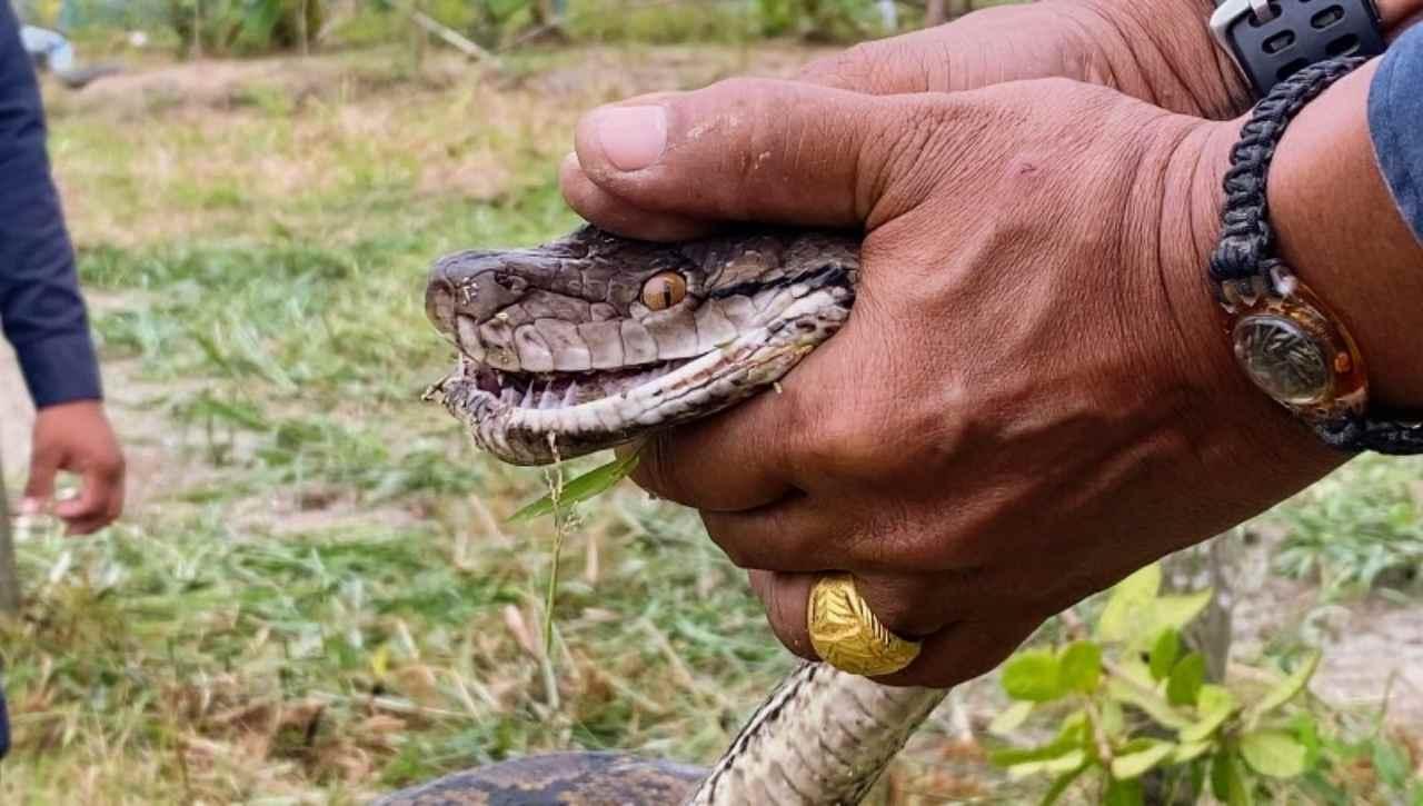 ทั้งนี้ เจ้าหน้าที่ได้ใช้ไม้สำหรับจับงูเข้าปฏิบัติการ โดยพยายามใช้ไม้เขี่ยไปที่ตัวงูที่กำลังจะเลื้อยหนี แต่ไม้จับด้ามหัก ซึ่งเจ้าหน้าที่ไม่ละความพยายาม ใช้มือเปล่าจับหางงูและดึงลากตัวขึ้นมาจากกอหญ้า ซึ่งคาดว่า งูเหลือมตัวดังกล่าวอยู่ในอาการตกใจและพยายามจะพุ่งเข้าฉกเจ้าหน้าที่อยู่ตลอดเวลา จนต้องกระโดดหนี ซึ่งสุดท้ายเจ้าหน้าที่ก็สามารถจับเจ้างูเหลือมไว้ได้