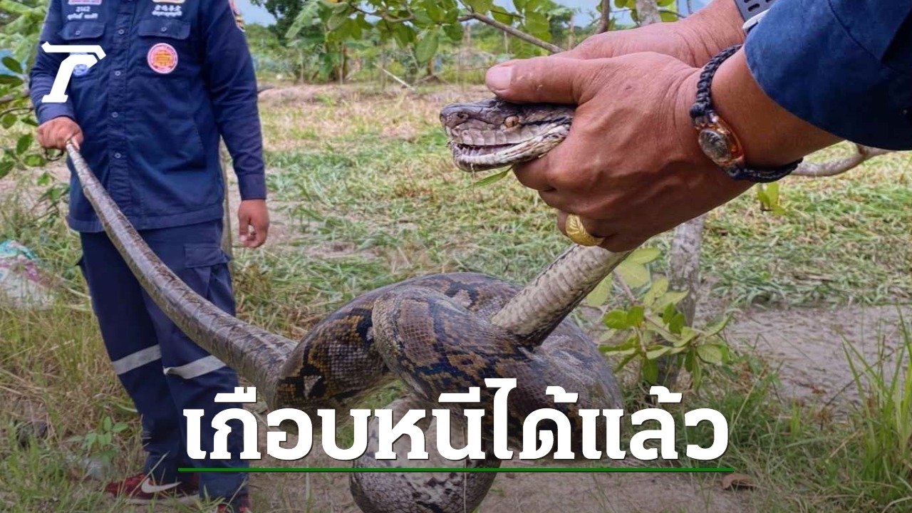 "งูเหลือม" ตัวใหญ่แอบเลื้อยเขมือบเป็ดของชาวบ้าน แจ้งกู้ภัยจับกันวุ่น หลังไม้จับงูหัก ต้องใช้มือเปล่าดึงหางงู หวิดโดนฉกหลายครั้ง