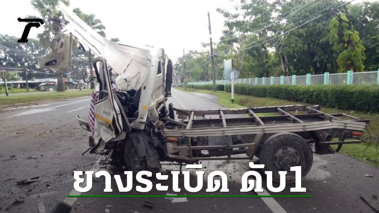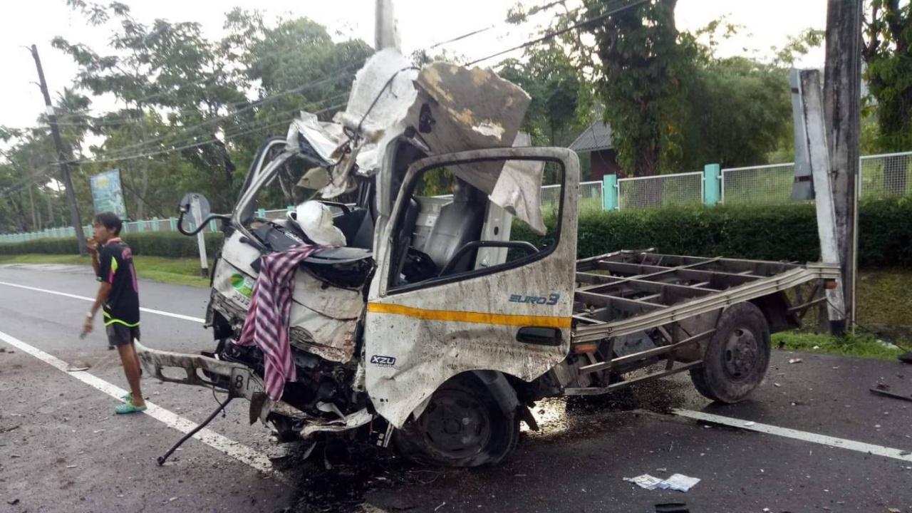 อุบัติเหตุที่ภูเก็ต รถบรรทุกยางระเบิด เสียหลักฟาดเสาไฟฟ้า ห้องโดยสารพังยับ ส่วนตู้บรรทุกหลุดไปฟาดติดกับต้นตาลเกาะกลางถนน คนขับกระเด็นตกรถเสียชีวิตอนาถ