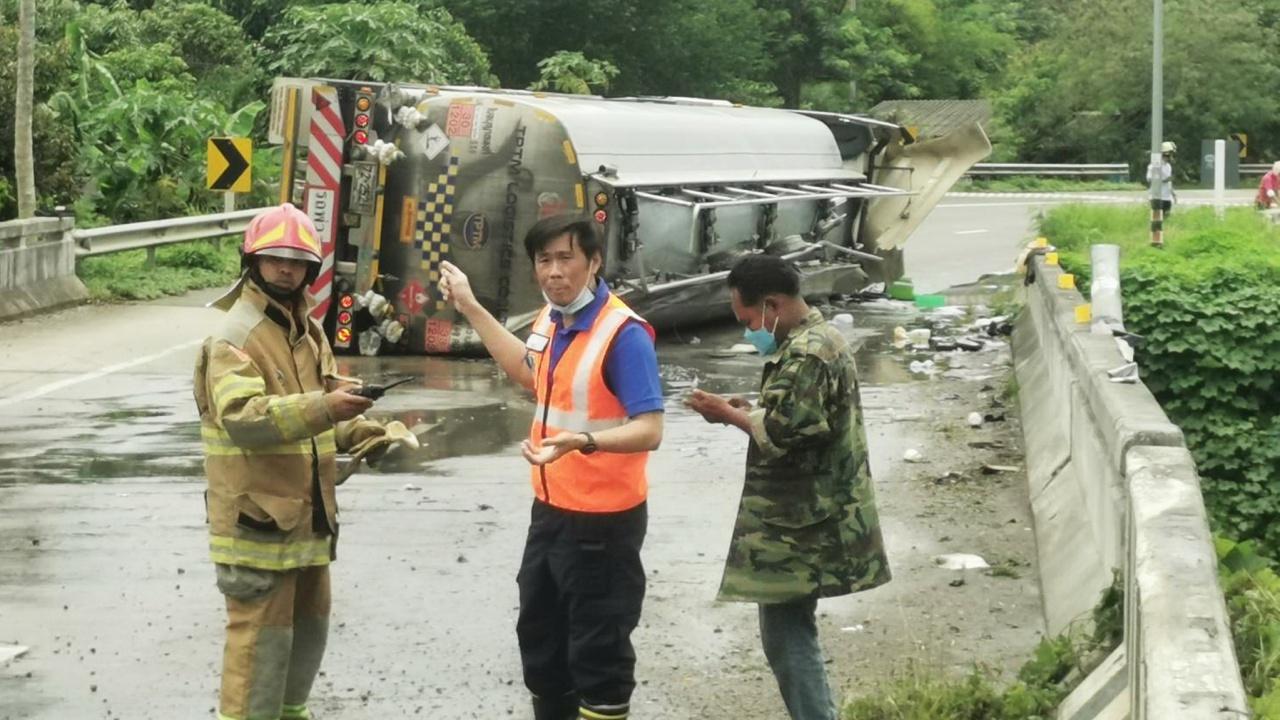 เวลา 14.00 น. วันที่ 3 ส.ค. 65 ศูนย์วิทยุ 191 กองกำกับการตำรวจภูธรจังหวัดชุมพร ได้รับแจ้งเหตุมีรถพ่วงบรรทุกน้ำมันเสียหลักพลิกคว่ำมีน้ำมันดีเซลรั่วไหลจำนวนมาก บนถนนสายเพชรเกษมบริเวณโค้งน้ำพุด สะพานห้วยปริง หมู่ 2 ตำบลวังใหม่ อ.เมือง จ.ชุมพร จึงประสานเจ้าหน้า ปภ.จ.ชุมพร หน่วยกู้ภัยสายชล มูลนิธิชุมพรการกุศลสงเคราะห์ และรถดับเพลิงพื้นที่ใกล้เคียง ออกช่วยเหลือป้องกันเพลิงลุกไหม้