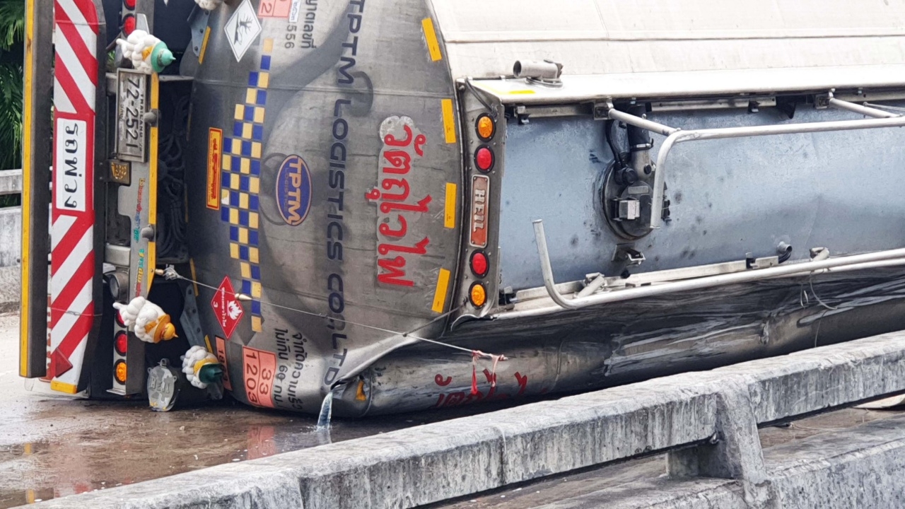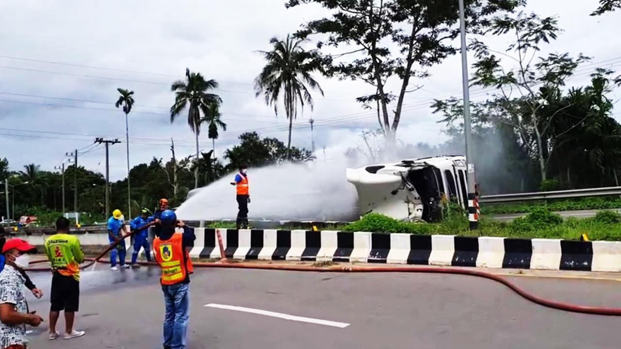 รถเทรลเลอร์บรรทุกน้ำมันดีเซล จากคลังน้ำมันปากน้ำชุมพร จะส่งลงเรือไปประเทศเมียนมาที่ระนอง พลิกคว่ำกลางสะพานถนนเพชรเกษม น้ำมันในแทงก์กว่า 4 หมื่นลิตรรั่วนองถนน ไหลลงคลองต้องกันรถทั้งขาขึ้นขาล่อง หวั่นทำให้เกิดประกายไฟ