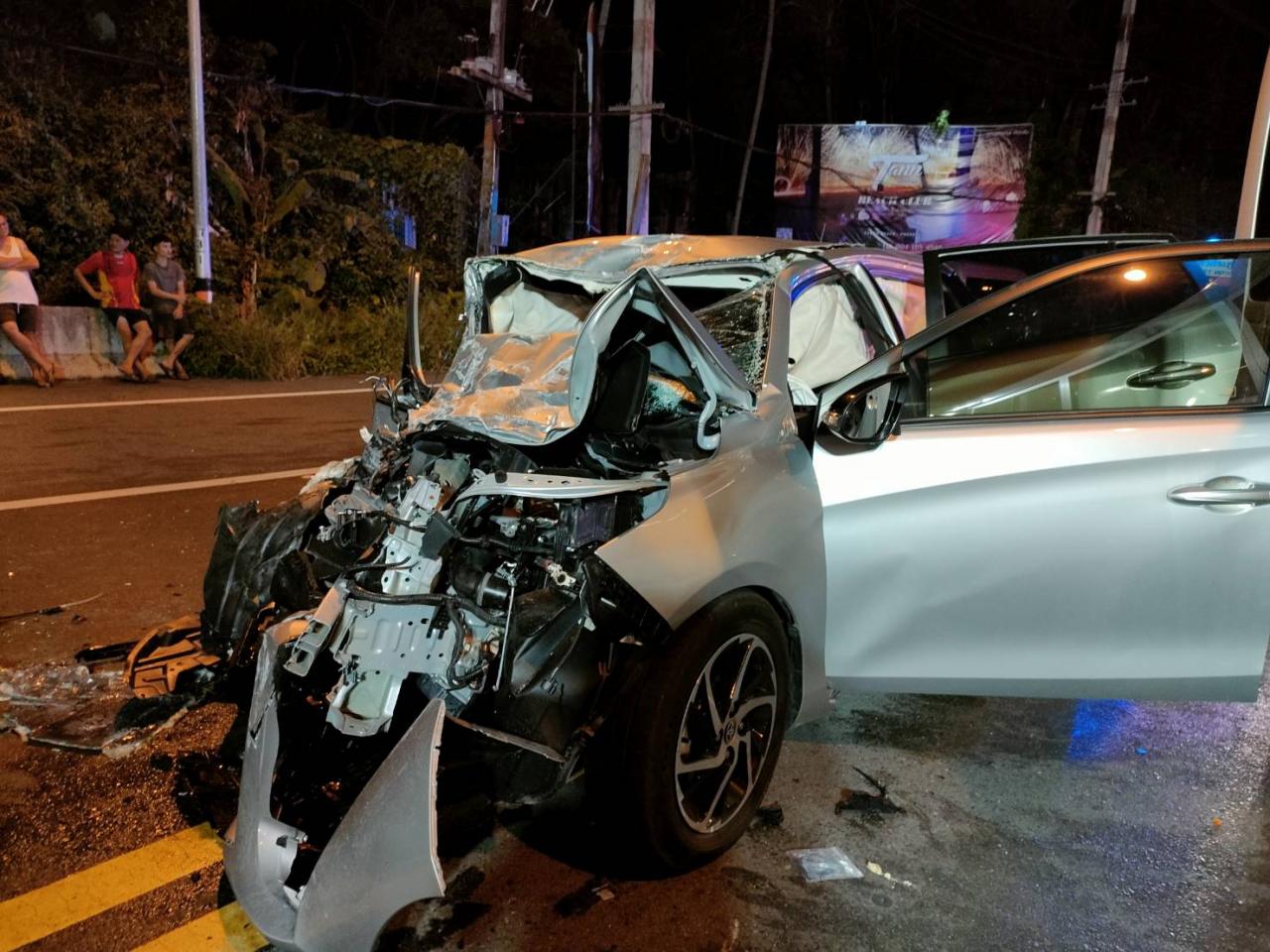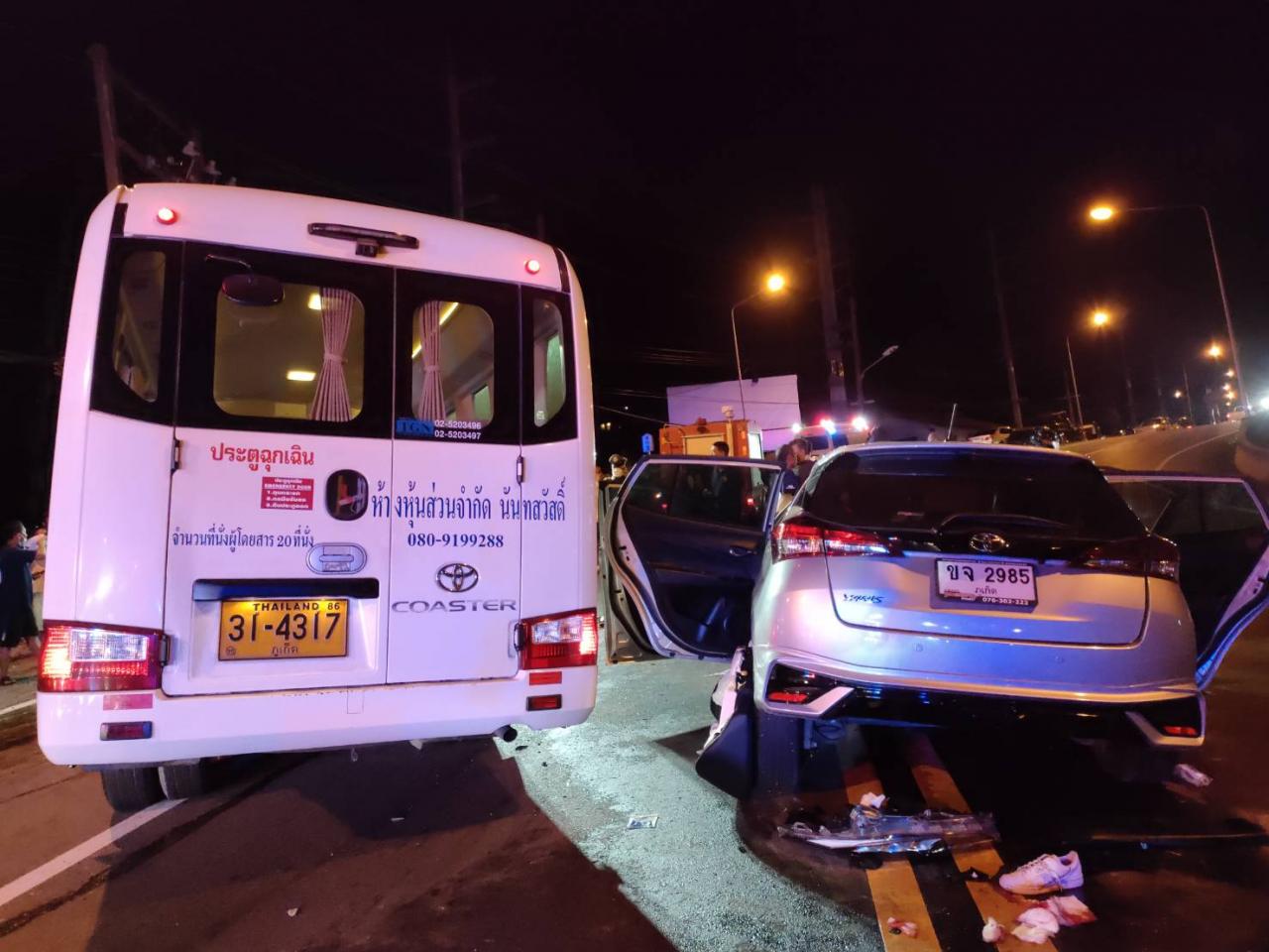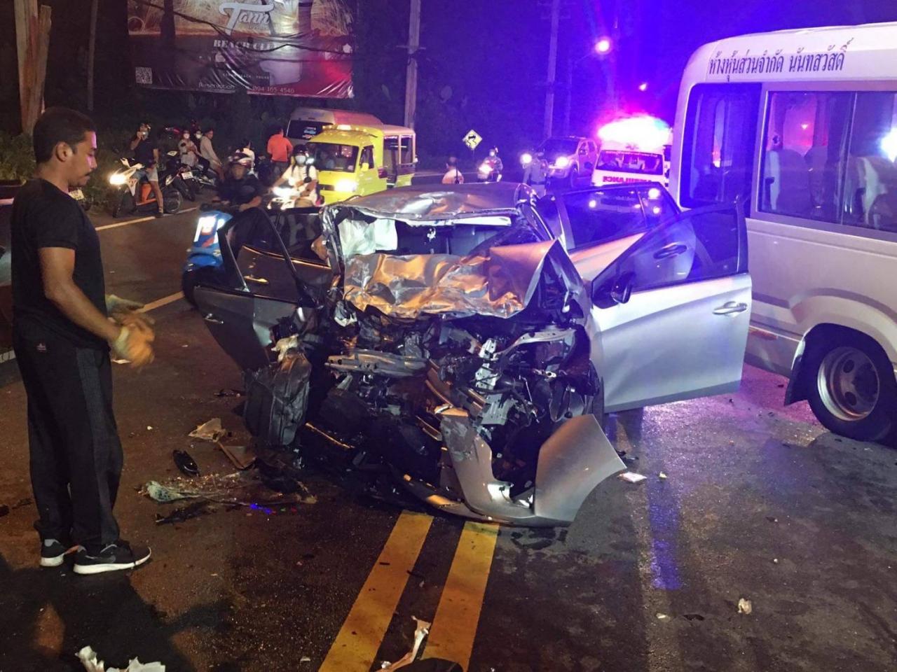 ที่เกิดเหตุเป็นถนนขนาด 4 ช่องเลน และเป็นทางลาดชันขึ้นลงเนินเขา พบรถบัสขนาด 20 ที่นั่ง ยี่ห้อโตโยต้า สีขาว รุ่นน Coaster ทะเบียนป้ายเหลือง 31-4317 ภูเก็ต มีนายอนิรุธ โฉมเชิด อายุ 32 ปี เป็นคนขับ ภายในรถมีไกด์ชายชาวเกาหลีใต้ 1 คน และล่ามแปลภาษาอีก 1 คน สภาพรถถูกชนด้านขวาและฝั่งคนขับพังเสียหาย หัวรถพุ่งเปลี่ยนไปอีกเลน ใกล้กันพบรถเก๋งโตโยต้ายาริส สีบรอนซ์เงิน ทะเบียน ขจ 2985 ภูเก็ต ภายในรถมีผู้บาดเจ็บเป็นชาวสิงคโปร์ ชาย 2 หญิง 2 ราย ถูกอัดก๊อบปี้ติดอยู่ภายในรถ โดยสภาพด้านหน้ารถพังยับเยิน หน่วยกู้ภัยเร่งใช้อุปกรณ์ตัดถ่างนำผู้บาดเจ็บออกจากตัวรถเก๋ง 4 ราย และผู้บาดเจ็บอีก 3 รายจากรถบัส แยกกันนำส่ง รพ.ฉลอง รพ.วชิระภูเก็ต และ รพ.ป่าตอง อย่างเร่งด่วน โดยมี น.ส.Ho Jia Hui Renee อายุ 21 ปี ชาวสิงคโปร์เป็นคนขับรถเก๋งคันดังกล่าวได้รับบาดเจ็บสาหัสและเสียชีวิตในที่เกิดเหตุ จึงนำศพส่งชันสูตรที่ รพ.วชิระภูเก็ต