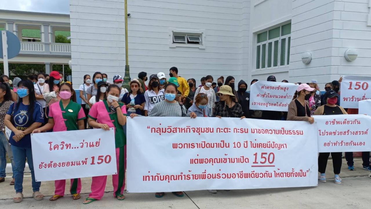 วันที่ 19 สิงหาคม ที่ศาลากลางจังหวัดภูเก็ต กลุ่มหมอนวดแผนไทยและนวดชายหาดในจังหวัดภูเก็ต รวมตัวกันประมาณ 100 คน นำโดย นายธรรพ์ษิวิชย์ คล้ายชะเอม ผู้มีอำนาจจัดการแทนกลุ่มวิสาหกิจชุมชนนวดแผนไทยตำบลกะรน และสมาชิก รวมถึงร้านนวดต่างๆ ในจังหวัดภูเก็ต ยืนถือป้ายข้อความ อาทิ กลุ่มวิสาหกิจชุมชนกะตะกะรนมาขอความเป็นธรรม พวกเราเปิดมาเป็น 10 ปี ไม่เคยมีปัญหา แต่พอคุณเข้ามาเปิด 150 เท่ากับคุณทำร้ายเพื่อนร่วมอาชีพเดียวกัน ให้ตายทั้งเป็น, โควิดว่าแย่ ยังต้องยอมแพ้ 150, โควิดทำเสีย 150 ทำพัง ฯลฯ พร้อมถือโทรโข่งตะโกนว่า 150 บาทออกไป