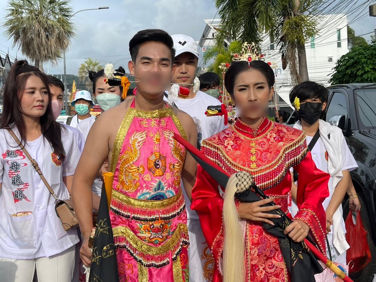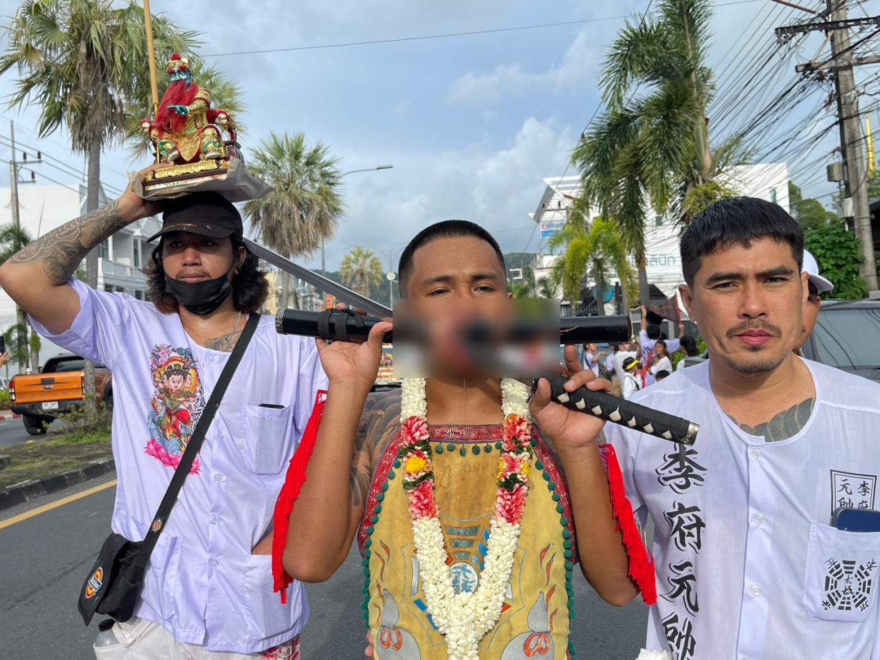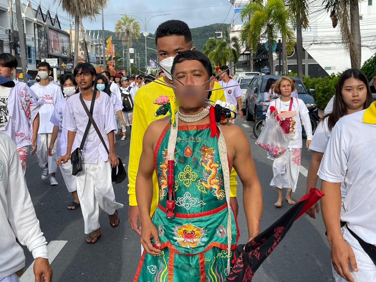 ภูเก็ต แห่พระรอบเมือง วันแรก เหล่าม้าทรงชายหญิงใช้อาวุธนานาชนิดทิ่มแทงทรมานร่างกาย เพื่อรับเคราะห์แทนผู้เข้าร่วมถือศีลกินผัก หรือ เจี๊ยะฉ่าย