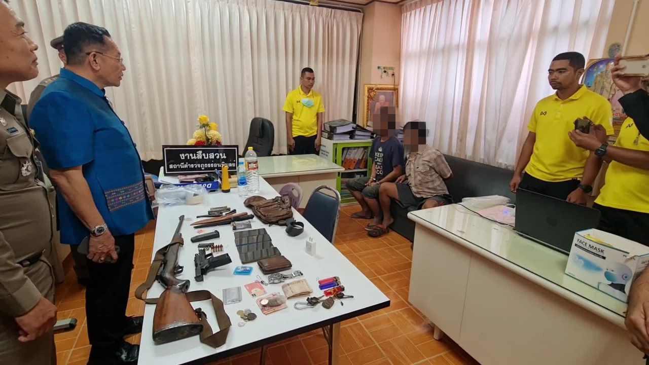 ขณะรับแจ้งขอความช่วยเหลือ พ.ต.ท.ธนวัฒน์ หิ้นยกฮิ่น รอง ผกก.5 บก.ป. พ.ต.ต.ปิยะพร เรียนสุทธิ์ สว.กก.5 บก.ป. ร.ต.อ.ธีระพงษ์ คงเขียว รอง สว.กก.5 บก.ป. พร้อมเจ้าหน้าที่ตำรวจ กก.5 กองบังคับการปราบปราม ซึ่งทำกิจกรรมจิตอาสาอยู่ที่ อบต.ควนพัง อ.ร่อนพิบูลย์ ใกล้กับบริเวณดังกล่าว ได้นำกำลังเจ้าหน้าที่พร้อมรถยนต์เข้าตรวจสอบ เมื่อพบรถยนต์คันต้องสงสัย เจ้าหน้าที่จึงได้เข้าแสดงตัว เบื้องต้นทราบชื่อชายผู้นี้คือ นายธีระพงศ์ เพื้อนุ้ย อายุ 33 ปี ชาวตำบลควนพัง พยายามขัดขืน และขับรถชนรถเจ้าหน้าที่จนได้รับความเสียหาย เจ้าหน้าที่ต้องใช้อาวุธปืนยิงล้อรถสกัดไม่ให้หลบหนี ก่อนที่จะชาร์จคุมตัวไว้ได้ โดยยังมีเพื่อนที่นั่งอยู่ในรถ 1 รายคือ นายเชาวลิต มณีมาศ อายุ 33 ปี ชาวตำบลควนพัง ตรวจค้นในรถพบ อาวุธปืน 2 กระบอก พร้อมเครื่องกระสุนปืน และยาบ้า 17 เม็ด พร้อมอุปกรณ์ที่เกี่ยวข้องอีกจำนวนหนึ่ง เงินสดหลายหมื่นบาท เจ้าหน้าที่จึงได้ตรวจยึดและนำตัวส่งดำเนินคดี