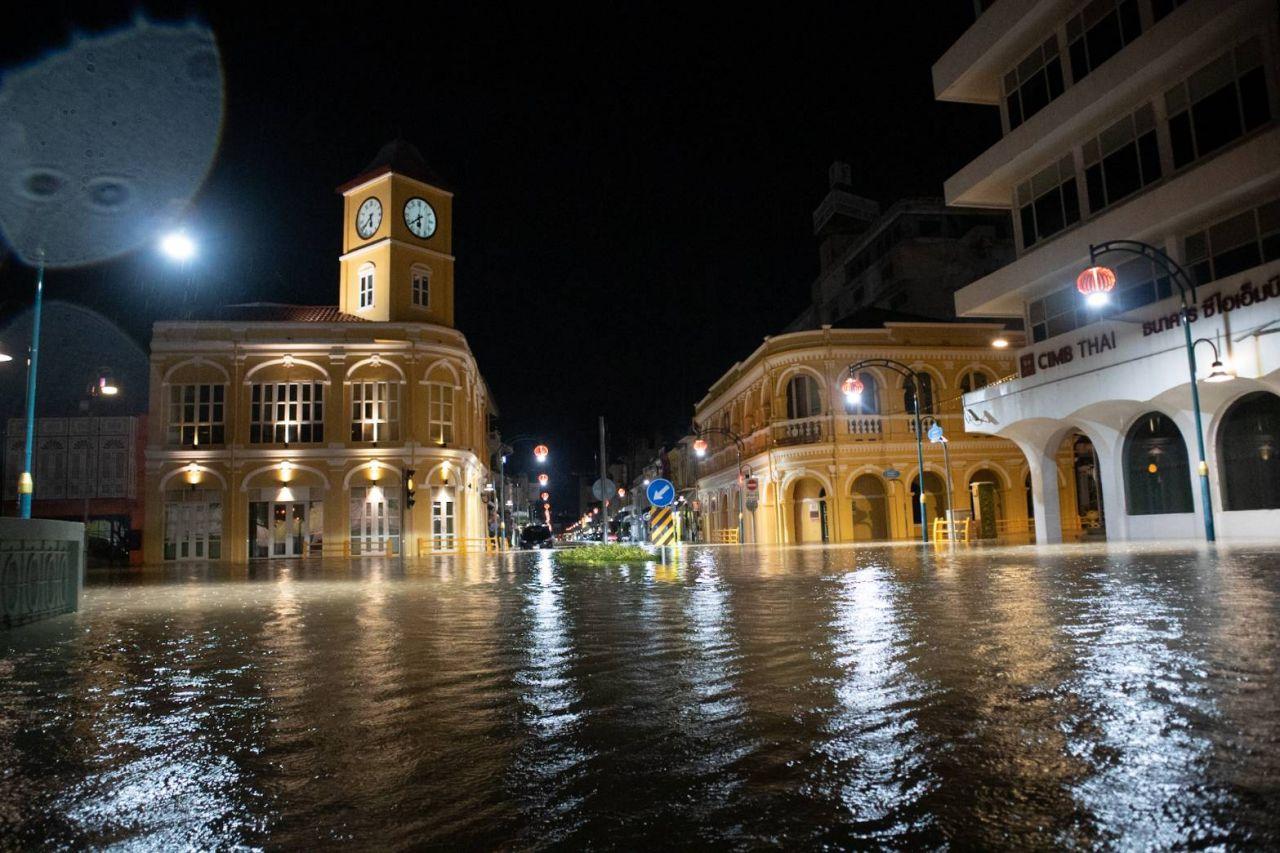 ตลอดทั้งคืนตั้งแต่กลางดึกวันที่ 15 ต.ค. 65 ต่อเนื่องจนถึงรุ่งเช้าวันที่ 16 ต.ค. 65 ในพื้นที่ จ.ภูเก็ต ได้มีฝนตกอย่างหนักและต่อเนื่องนานหลายชั่วโมง ส่งผลให้เขตเทศบาลนครภูเก็ตจมบาดาล โดยเฉพาะบริเวณแลนด์มาร์กย่านเมืองเก่า เช่น แยกธนาคารชาร์ตเตอร์ ถนนเทพกระษัตรีตัดถนนถลาง ถนนถลาง ซึ่งเป็นย่านเมืองเก่าอาคารชิโนโปรตุกีส บริเวณวงเวียนหอนาฬิกามีน้ำท่วมสูง 50 ซม.ถึง 1 เมตร รถเล็กไม่สามารถผ่านได้ โดยต้องรอให้ฝนทิ้งช่วง จะทำให้น้ำที่ท่วมบนถนนไหลลงสู่คลองบางใหญ่