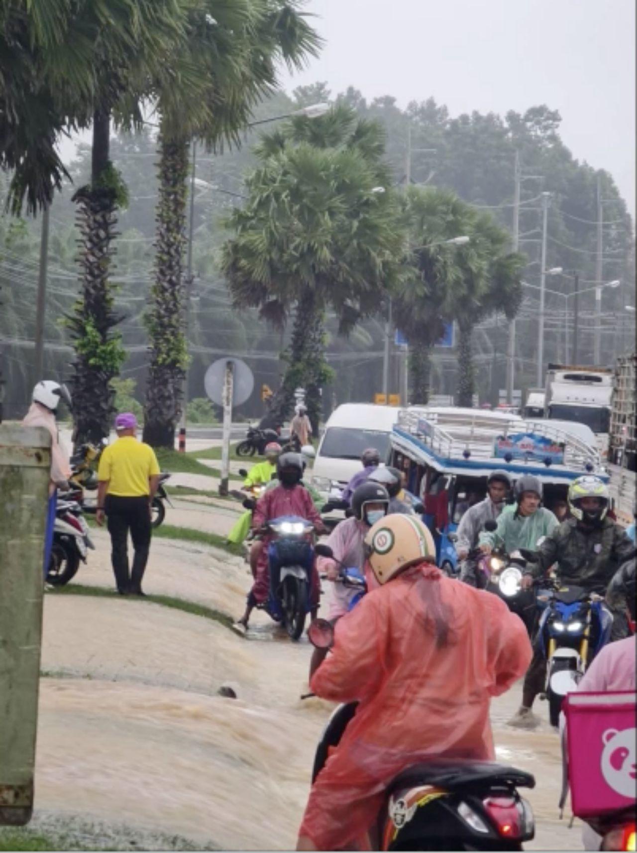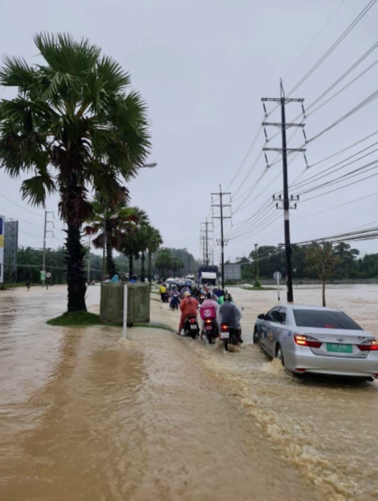 ถนนเทพกระษัตรี (ทล.402 ขาเข้าเมือง) น้ำท่วมขังใช้ช่องจราจรได้เพียง 1 ช่อง หมู่ที่ 8 ตำบลเทพกระษัตรี น้ำไหลทะลักเข้าท่วมบ้านเรือนประชาชน ห้องเช่าหลังธนาคารไทยพาณิชย์ ฝั่งตรงข้ามโรงพักเชิงทะเล ตำบลเชิงทะเล เกิดน้ำท่วมขัง หมู่บ้านสมายวิลเลจ ตำบลศรีสุนทร เกิดน้ำท่วมขังบ้านเรือนประชาชน หมู่ที่ 4 หมู่บ้านเติมฝัน ตำบลศรีสุนทร เกิดน้ำท่วมขังบ้านเรือนประชาชน