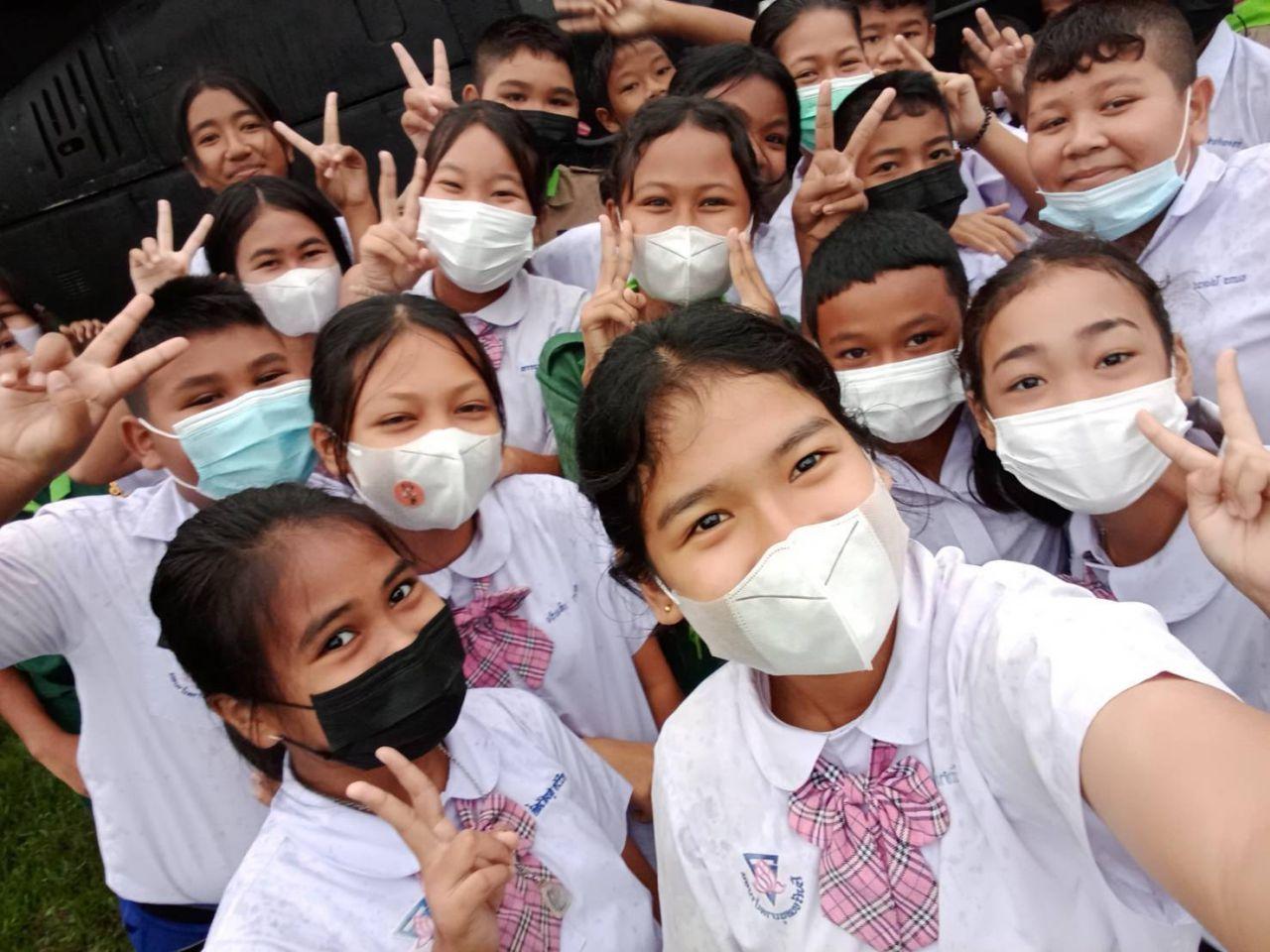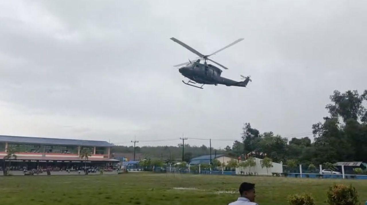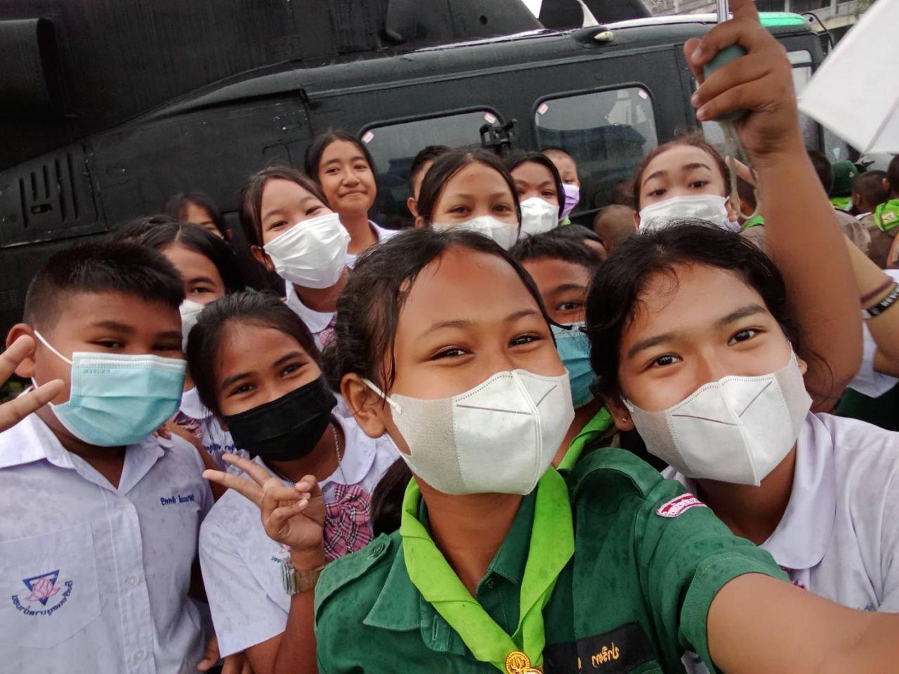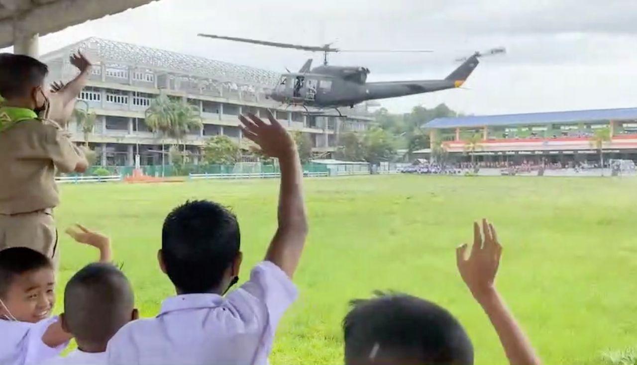 โดยขณะร่อนลงจอด ทำให้เด็กนักเรียนเกือบ 1 พันคน ที่กำลังเรียนหนังสือ ต่างออกมาโบกไม้โบกมือ ส่งเสียงร้องด้วยความดีใจ เมื่อเฮลิคอปเตอร์ลงจอดได้อย่างปลอดภัย ก่อนที่เด็กนักเรียน พร้อมครูได้เดินทางไปต้อนรับนักบินและทหารที่เดินทางมา พร้อมเขียนข้อความเพื่อให้กำลังใจ และถ่ายภาพกับเครื่องบนอย่างใกล้ชิด