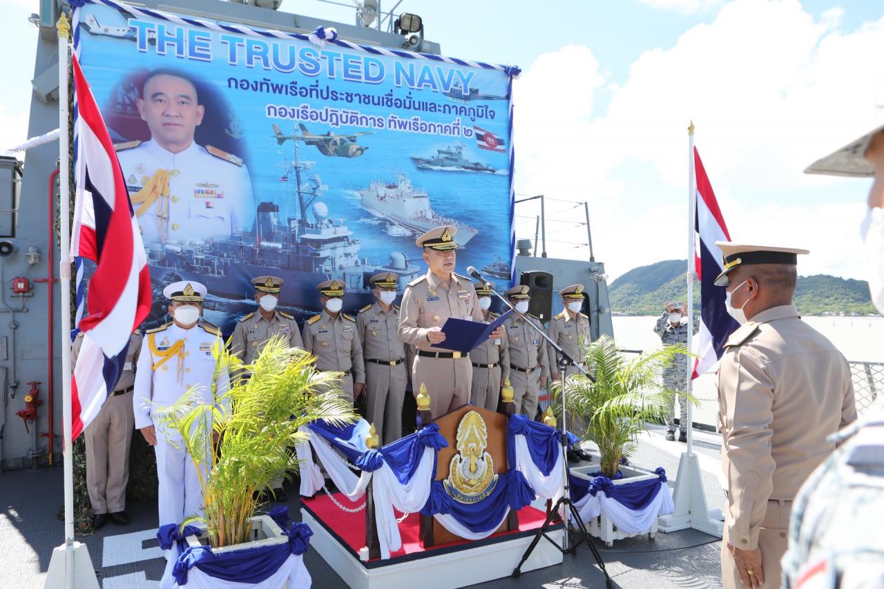 ในเวลาต่อมา ผู้บัญชาการทหารเรือ และคณะ ได้เดินทางไปยัง เรือหลวงนราธิวาส ซึ่งจอดเทียบท่า ณ ท่าเทียบเรือ ฐานทัพเรือสงขลา เพื่อตรวจเยี่ยมกองเรือปฏิบัติการทัพเรือภาคที่ 2 ผู้บัญชาการทหารเรือได้มอบโอวาทเน้นย้ำว่า