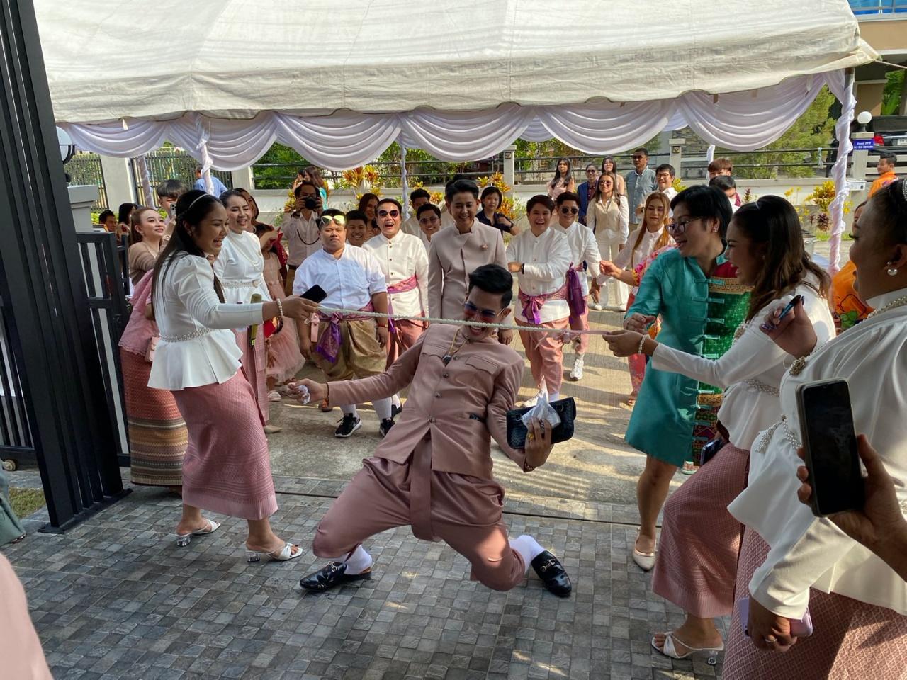 สำหรับเจ้าบ่าวที่นำขบวนขันหมากสู่ขอเจ้าสาวครั้งนี้ชื่อ นางสาวกัญญา ผิวนวล หรือปุ๊ก อายุ 39 ปี ส่วนเจ้าสาวชื่อ นางสาวสนทิศา สิริยานนท์ หรือเมย์ อายุ 36 ปี สินสอดทองหมั้น มีเงินสด 1 ล้านบาท พร้อมทองคำรูปพรรณ และแหวนเพชร 2 วง โดยขบวนขันหมากมาพร้อมเพลงจังหวะสนุกสนาน ญาติพี่น้องเพื่อนฝูงร่วมร้องรำนำเจ้าบ่าวผ่านประตูเงินประตูทองเข้าพิธีมงคลสมรสตามประเพณี.