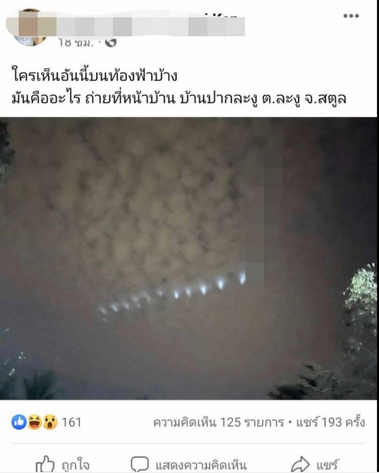 จากกรณีผู้ใช้เฟซบุ๊กหลายรายในพื้นที่ จ.สตูล ได้โพสต์ภาพดวงไฟประหลาดหลายดวงบนท้องฟ้า จนมีการแชร์ภาพดังกล่าวออกไปอย่างแพร่หลาย โดยแสงไฟดังกล่าวโผล่ขึ้นมาบนท้องฟ้าเวลา ประมาณ 19.00 น. ของวันที่ 7 มิถุนายนที่ผ่านมา ลักษณะดวงไฟดังกล่าวที่มองเห็น บางพื้นที่เห็นเป็นดวงไฟกลมๆ อยู่เรียงกันบนท้องฟ้ากว่า 10 ดวง บางคนก็เห็นเป็นลำแสงยาวบนท้องฟ้าแตกต่างกันไปในแต่ละพื้นที่ หลายอำเภอของ จ.สตูล ไม่ว่าจะเป็น อ.ควนกาหลง อ.ท่าแพ อ.ละงู และ อ.มะนัง จนมีการแสดงๆ ความคิดเห็นกันออกไปต่างๆ นานาหลายแง่หลายมุม บางคนก็บอกว่าเป็นยูเอฟโอ (UFO) บางคนก็เชื่อว่าเป็นดาวเทียม บางคนก็หาข้อมูลต่างๆ มาแชร์ หลากหลายความเห็นบางคนแสดงความคิดเห็นมาแบบตลกขำขัน