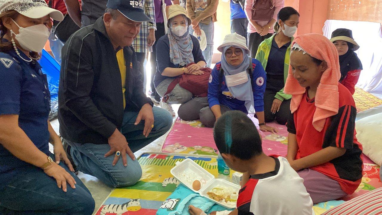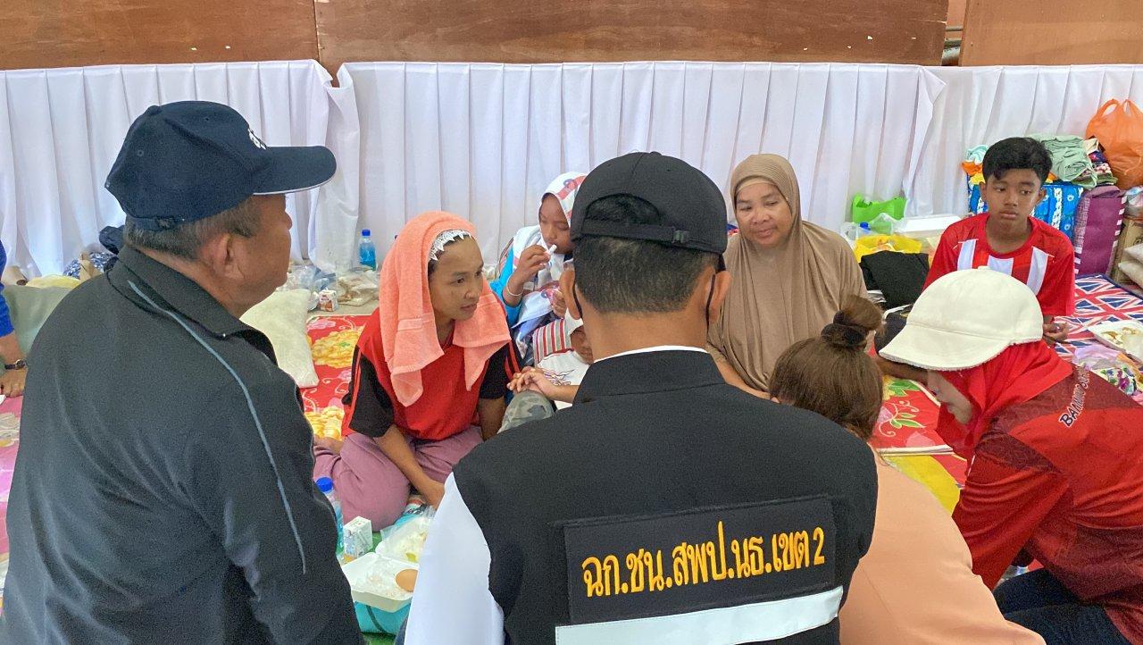 ด้าน นายสุพจน์ มณีรัตนโชติ ผอ.สพป.นธ.เขต 2 กล่าวว่า วันนี้จุดประสงค์หลักคือเข้ามาดูแลนักเรียนเป็นหลัก เพราะหน่วยงานเรามีหน้าที่เข้ามาดูแลนักเรียน ซึ่งมาตามดูว่านักเรียนที่ได้รับบาดเจ็บมีจำนวนกี่คน อาศัยอยู่ที่ไหน พักอย่างไร มีความเป็นอยู่อย่างไร มีความลำบากไหม และได้ระดมสรรพกำลังจากผู้ที่มีจิตศรัทธา ที่ได้บริจาคเข้ามาเพื่อมาช่วยเป็นการเบื้องต้น โดยการนำขนม ข้าวสาร อาหารแห้ง และเงินจำนวนหนึ่ง เอาให้ผู้ปกครองได้จับจ่ายใช้สอยในช่วงรักษาตัว และช่วงที่อยู่ที่ศูนย์พักพิงแห่งนี้.