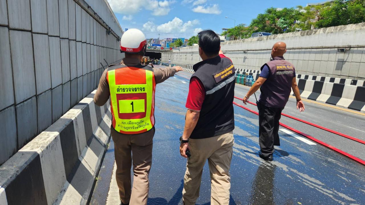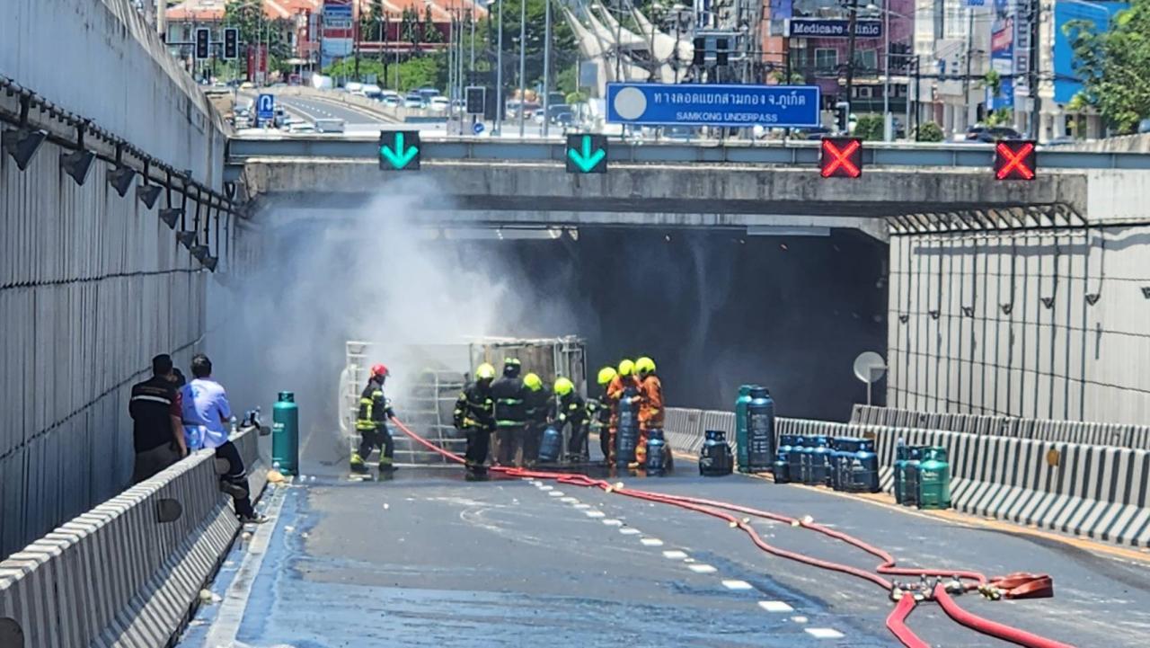 ระทึก อุโมงค์ทางลอดภูเก็ต รถบรรทุกแก๊สหุงต้มเสียหลักพลิกคว่ำแก๊สรั่ว ต้องปิดการจราจรกว่า 2 ชั่วโมง จนท.เร่งนำรถดับเพลิงเข้าฉีดน้ำสกัดควบคุมอุณหภูมิ เพื่อป้องกันการระเบิด