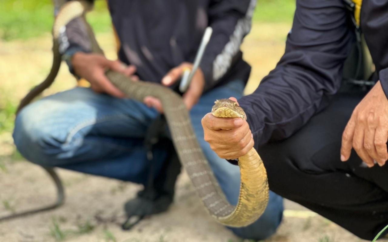 โดยการลงสำรวจหาในรอบแรกไม่เจอ จึงนั่งรอเวลาให้ถึงช่วง 3-4 โมงเย็นที่มีชาวบ้านบอกว่างูจงอางจะเลื้อยกลับ พร้อมแบ่งกำลังทีมออกสำรวจบริเวณใกล้เคียงจุดเกิดเหตุ กระทั่งมีได้ยินเสียงสุนัขเห่าดังมาจากสวนทุเรียน ซึ่งอยู่ไม่ไกลจากจุดที่ชาวบ้านถูกงูกัด จึงรีบไป พบกับงูจงอาง จึงเข้าจับ ใช้เวลาประมาน 10 นาทีก็สามารถจับไว้ได้ พร้อมให้ความรู้เพิ่มเติมกับชาวบ้านถึงวิธีการสังเกตว่าใช่งูจงอางหรือไม่ และหากถูกงูจงอางฉกจะต้องทำอย่างไร สัญชาติญาณของงูจงอางเมื่อเวลากัดเหยื่อแล้วจะกัดแน่นไม่ปล่อย แถมพ่นพิษใส่เหยื่ออยู่ตลอดเวลา ซึ่งหากถูกกัดให้ตั้งสติ และใช้มือจับหัวไว้ หากมีแอลกอฮอล์ เหล้า หรืออะไรก็ได้ที่มีส่วนผสมของแอลกอฮอล์ฉีดเข้าไปที่ปากของงู เพราะแอลกอฮอล์จะทำให้ระคายเคืองจากนั้นงูจะปล่อยเราเอง เมื่อทำความเข้าใจให้คำแนะนำกับชาวบ้านเสร็จแล้ว ได้นำงูจงอางที่จับได้ใส่ถุงผ้าสีดำ เพื่อนำไปปล่อยสู่ธรรมชาติต่อไป