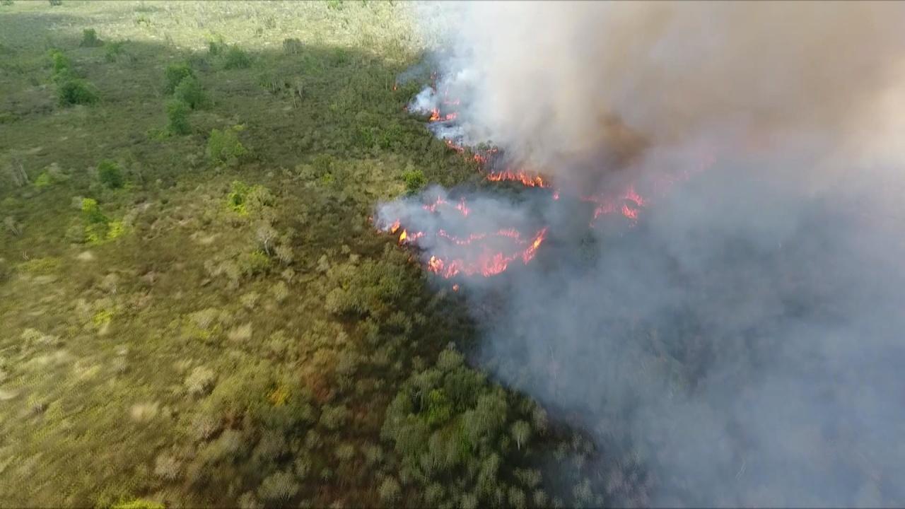 วันที่ 26 ส.ค. ภาพถ่ายทางอากาศจากโดรน สภาพไฟป่าพรุควนเคร็ง เขตห้ามล่าสัตว์ป่าทะเลน้อย ตำบลเคร็ง อำเภอชะอวด จังหวัดนครศรีธรรมราช กำลังลุกลามในพื้นที่บ้านควนยาว ควนชิง ตำบลเคร็ง อำเภอชะอวด ต่อเนื่องเข้าสู่วันที่ 3 ยังไม่สามารถควบคุมได้ เนื่องจากการเข้าถึงพื้นที่ การเคลื่อนย้ายอุปกรณ์เป็นไปด้วยความยากลำบาก ในพื้นที่นี้เต็มไปด้วยป่ากระจูด และป่าเสม็ดขาว และทรัพยากรสัตว์น้ำ ลิงแสมจำนวนมาก โดยฝูงลิงได้หลบหนีแนวไฟตามสัญชาตญาณหายไปจากพื้นที่ สันนิษฐานว่าบางส่วนอาจถูกไฟคลอก และสัตว์ครึ่งบกครึ่งน้ำจำพวกเต่าได้รับผลกระทบ โดยเฉพาะพื้นที่วางไข่